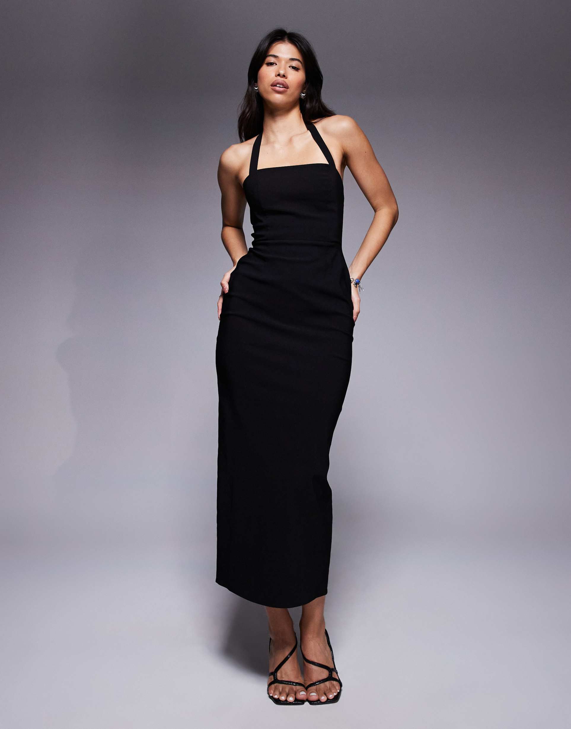 A sleek black midi sheath dress crafted from stretch woven bengaline fabric offers a crisp handle and subtle ribbed texture. Featuring a striking square neckline paired with a halter strap and an open back, this regular fit silhouette elegantly skims the body. The slit hemline adds a touch of allure to the minimalist design, making it perfect for date nights, cocktail parties, or nights out. The blend of viscose, nylon, and spandex ensures comfort and stretch, creating a sophisticated yet wearable piece for all seasons.