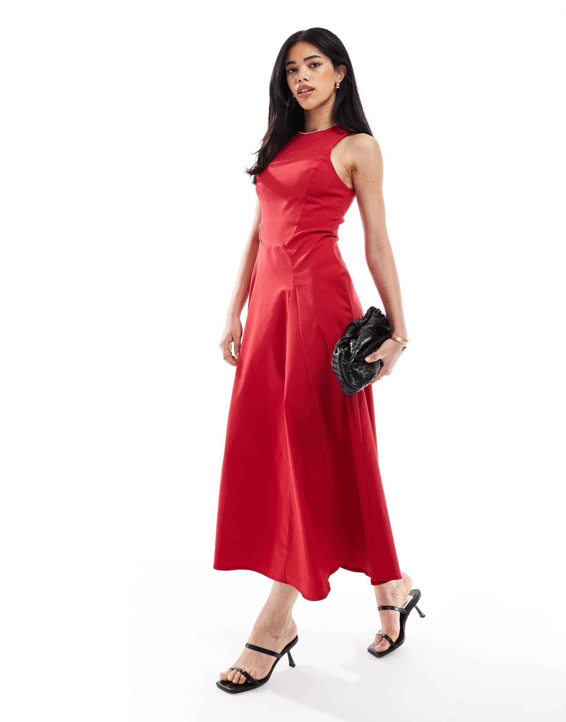 Sleek and structured, this red corset dress features a high neckline and a flattering tie-back detail, crafted in a crisp bengaline fabric with a subtle ribbed texture. Its sleeveless design and mini length create a sharp silhouette perfect for brunch dates, night outs, or sophisticated evening events. The regular fit offers comfort while maintaining elegance, making it a versatile choice for multiple occasions. The clean hemline and classic red hue add to its timeless appeal, enhanced by the fabric's gentle stretch for ease of movement.