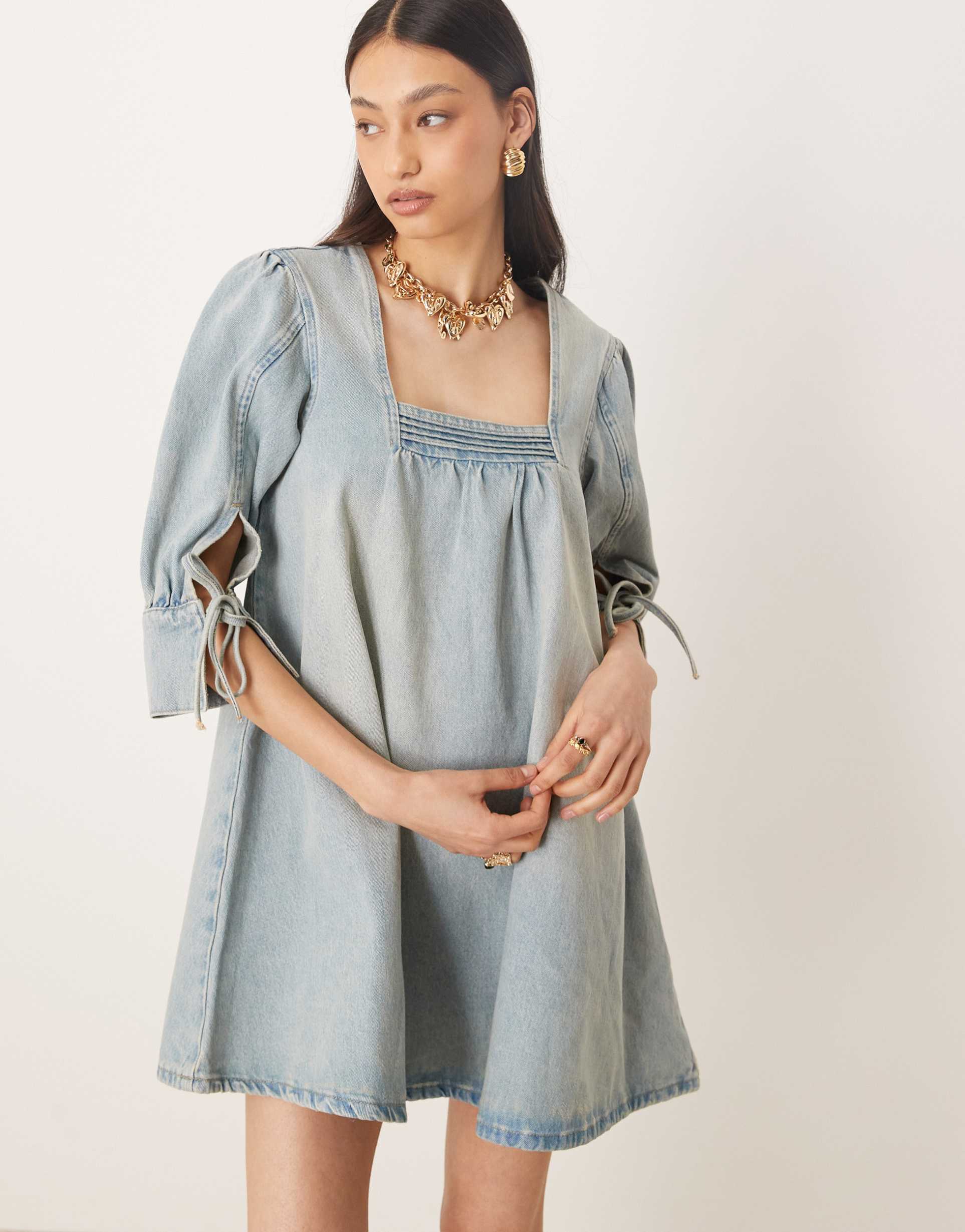 Dresses by ASOS DESIGNSquare neckBlouson sleevesTie cuffs Mini cutWashed finishRegular fitProduct Code: 143082172Non-stretch denim Main: 100% Cotton.