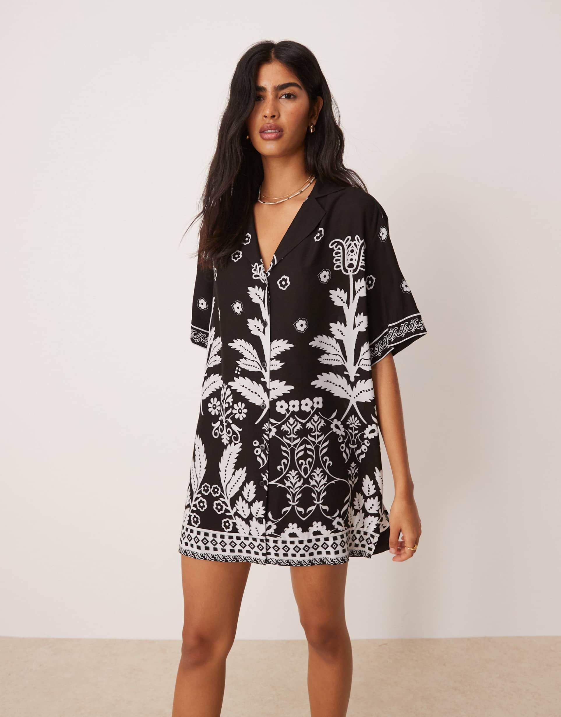 Monochrome vibes come alive with this oversized shirt dress featuring a bold all-over abstract print. Crafted from soft viscose, it offers an airy feel perfect for spring and summer days. The mini length and half sleeves balance casual comfort with chic style, while a classic camp collar and button-front closure add a polished touch. Ideal for casual outings, brunch dates, or everyday wear, this versatile piece blends minimalist appeal with modern ease.