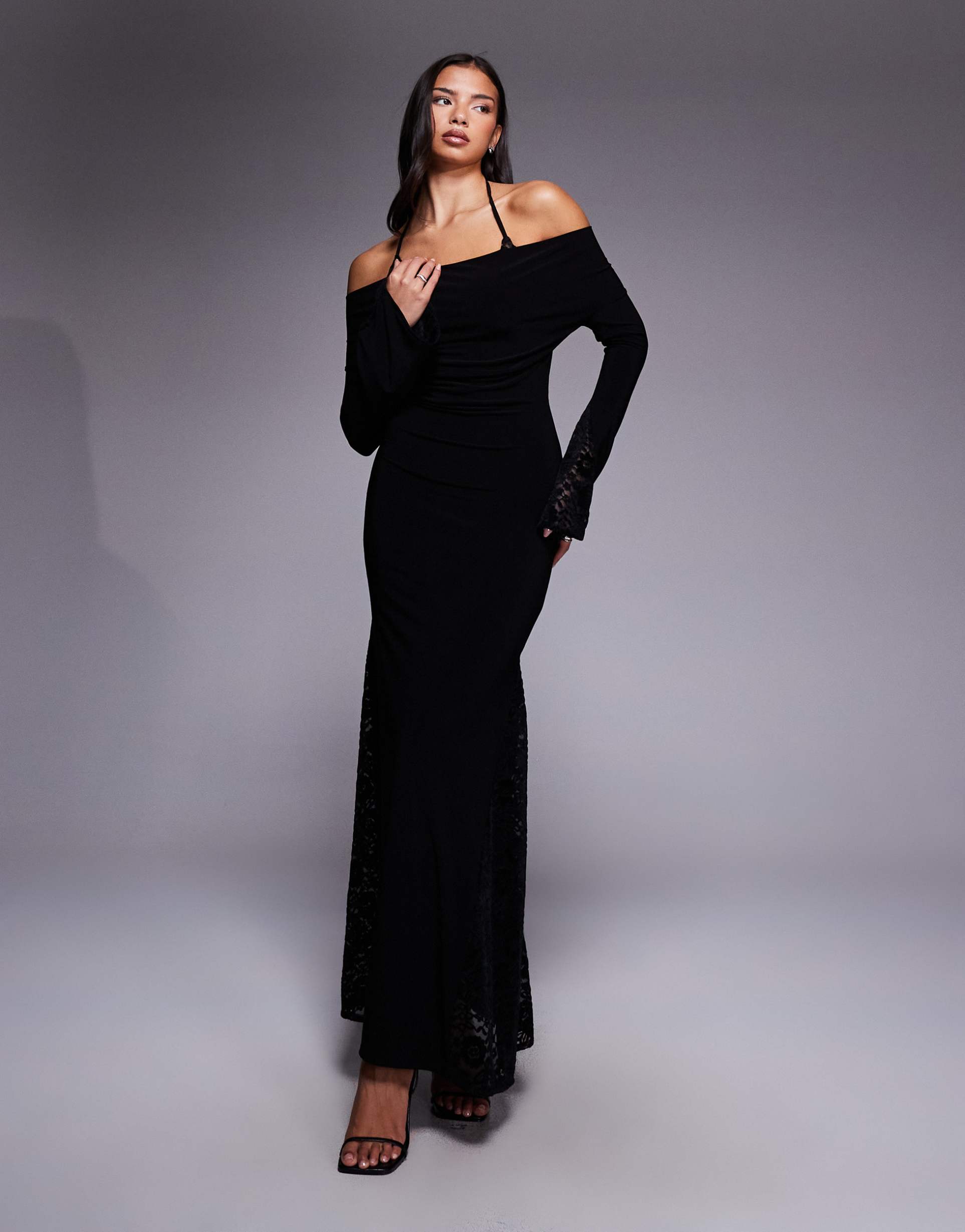 ASOS DESIGN BRA DETAIL LONG SLEEVE MAXI DRESS WITH LACE INSERTS IN BLACK