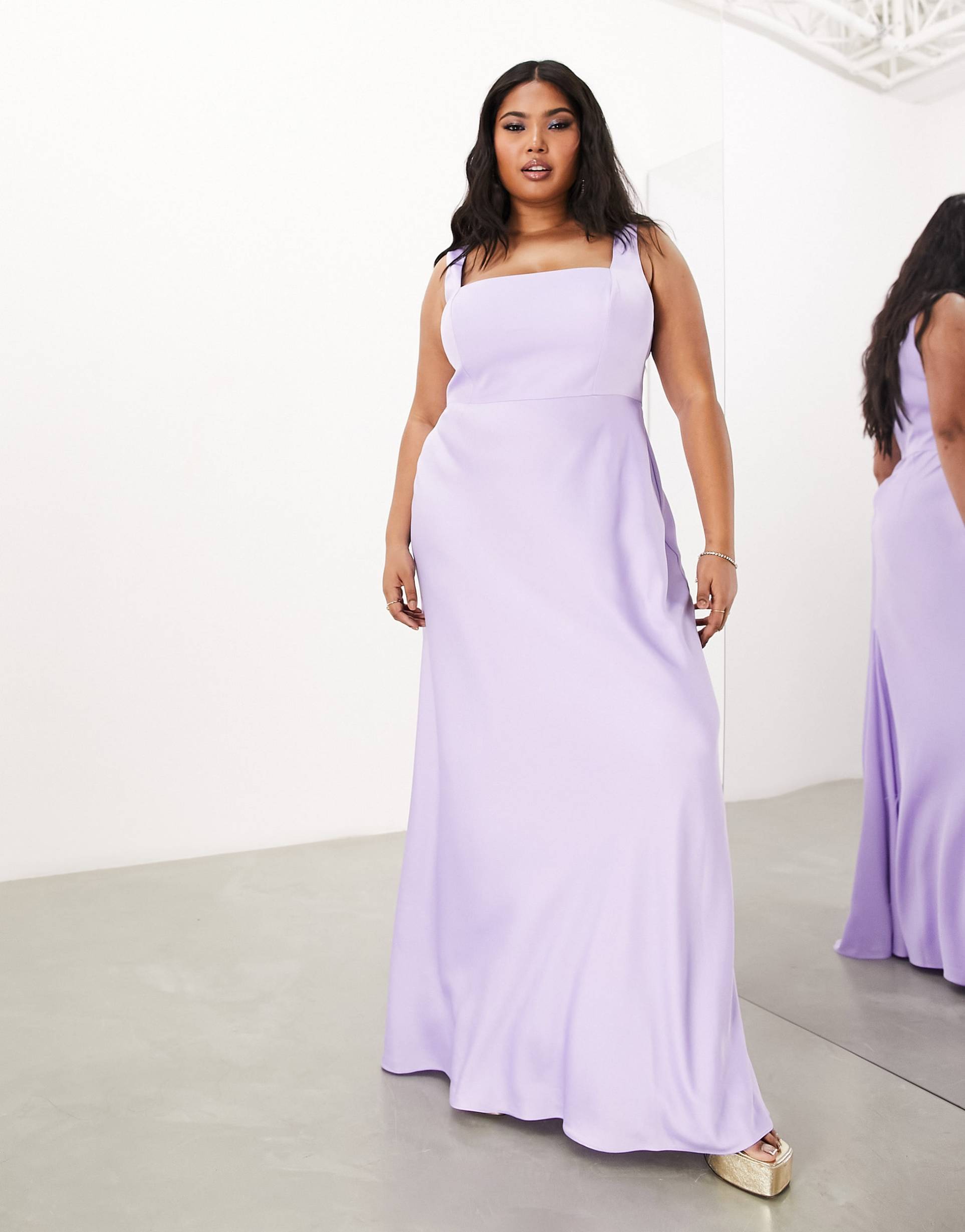 ASOS DESIGN BRIDESMAID CURVE SATIN SQUARE NECK MAXI DRESS IN LILAC