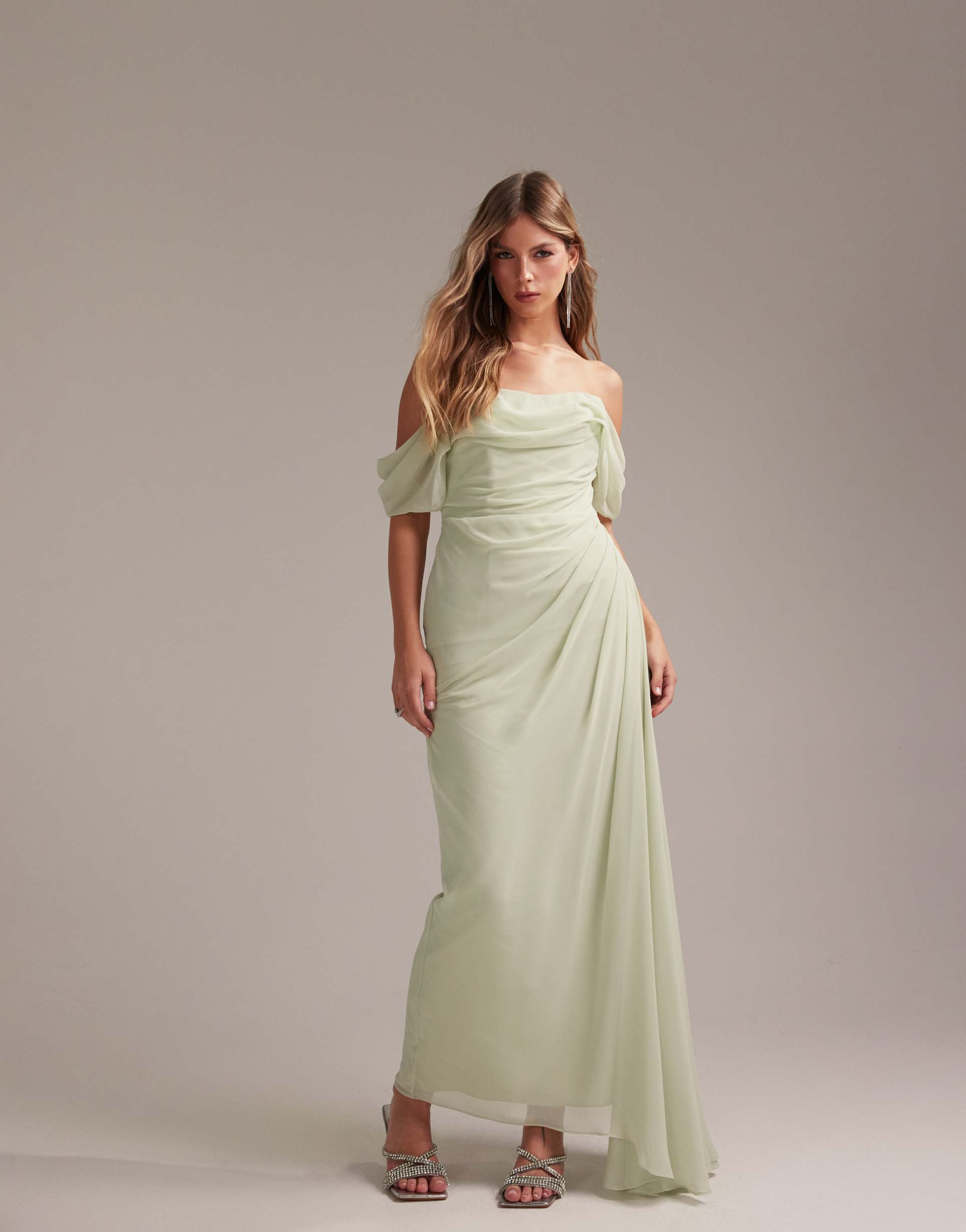 ASOS DESIGN BRIDESMAIDS DRAPED BARDOT MIDAXI DRESS IN LIGHT GREEN