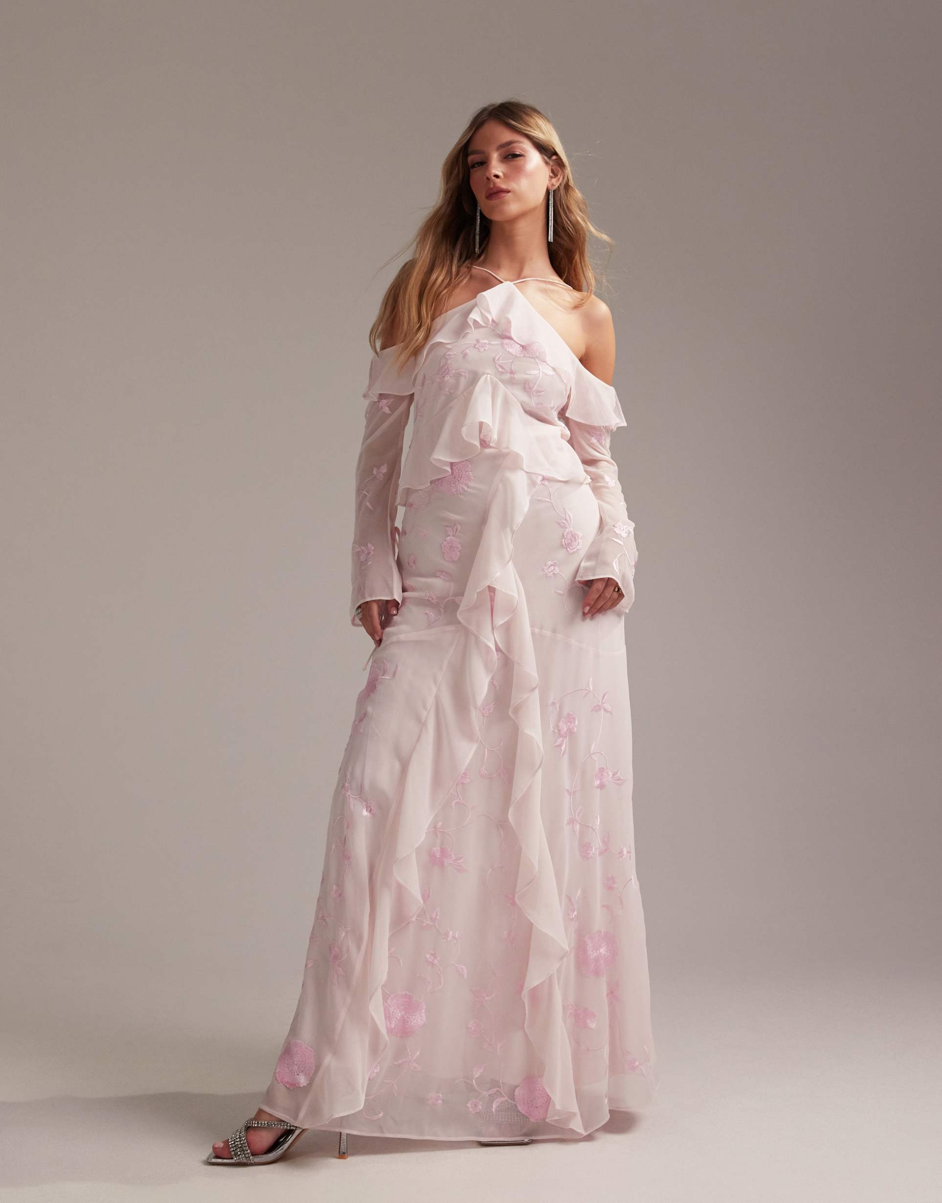 ASOS DESIGN BRIDESMAIDS RUFFLE COLD SHOULDER MAXI DRESS IN SOFT PINK