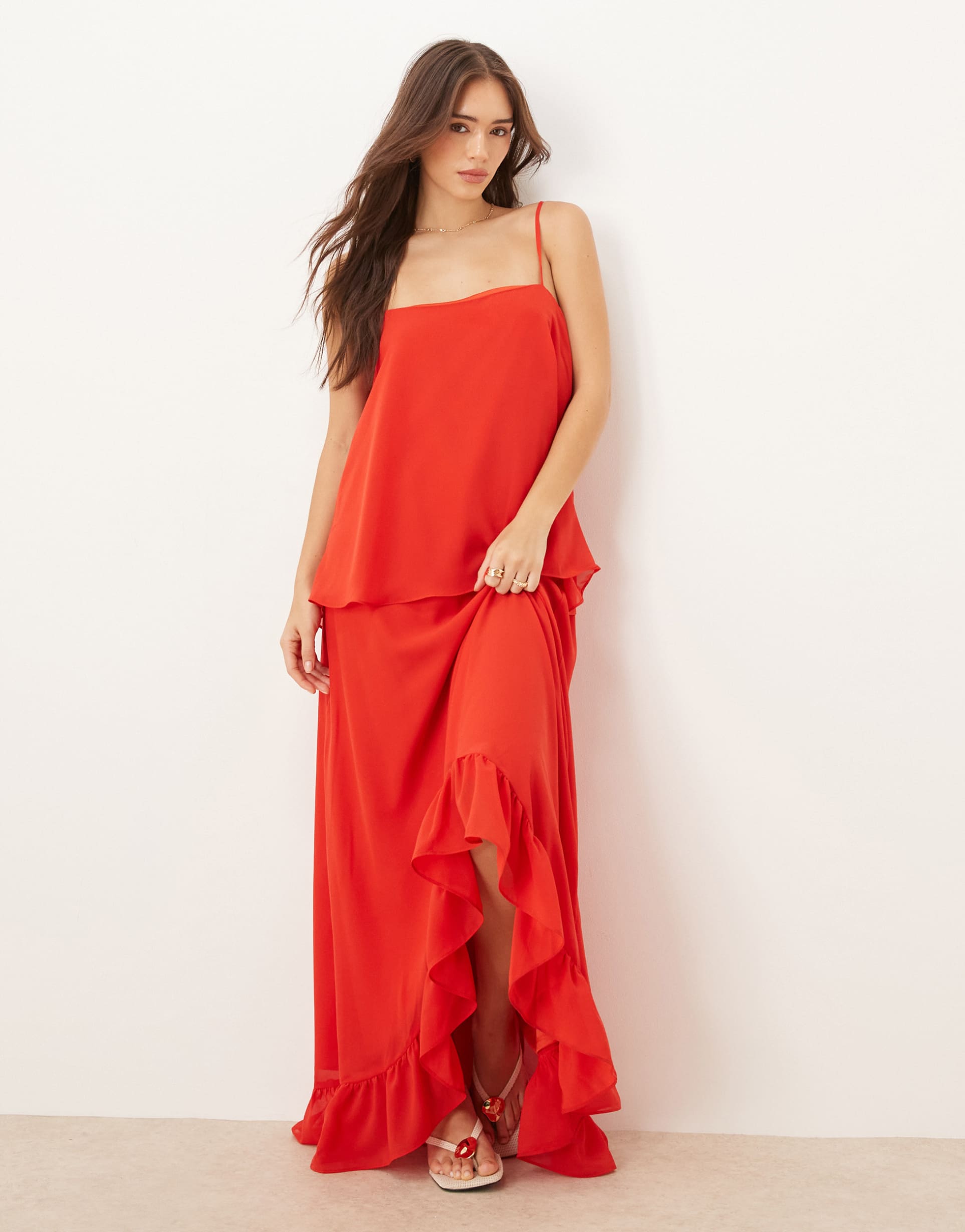 ASOS DESIGN CAMI CHIFFON FRILL HEM MAXI DRESS IN TOMATO RED