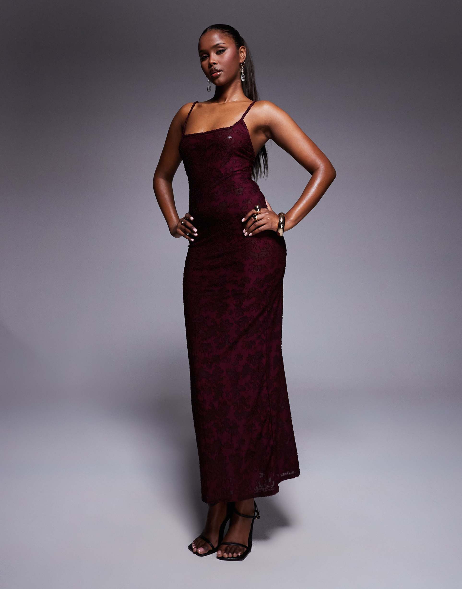 ASOS DESIGN CAMI SQUARE NECKLINE SHEER DEVORE MIDI DRESS IN WINE