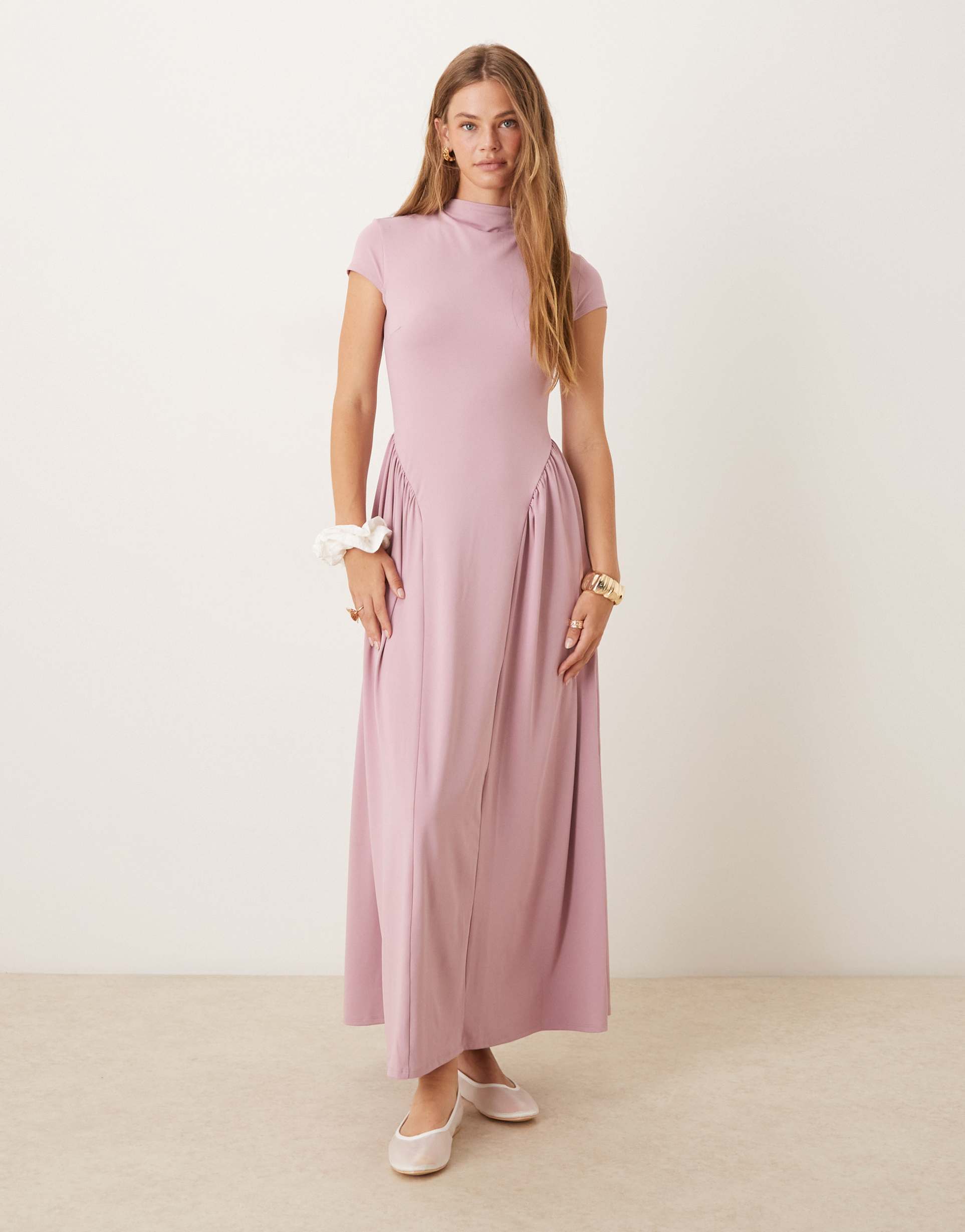 Soft matte dusty pink jersey fabric and a flowing maxi silhouette create an effortlessly elegant look with cap sleeves and a high neckline. The dress features subtle seam details on the front and back, enhancing its minimalist aesthetic. Designed with a regular fit, this versatile maxi gown is perfect for casual outings, spring brunches, and romantic date nights, combining comfort and style in one refined piece.