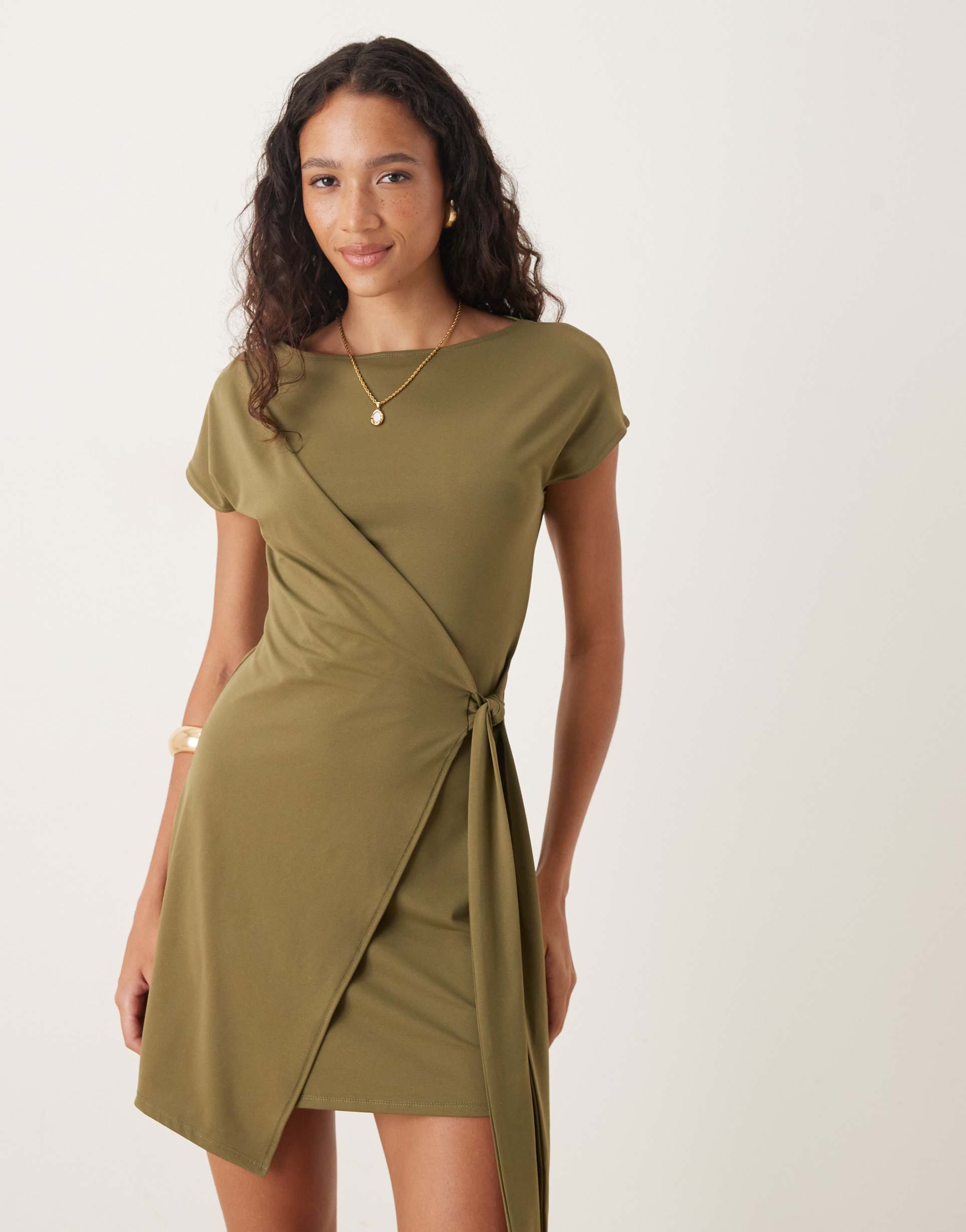 ASOS DESIGN CAP SLEEVE TIE WRAP FRONT MINI DRESS IN KHAKI