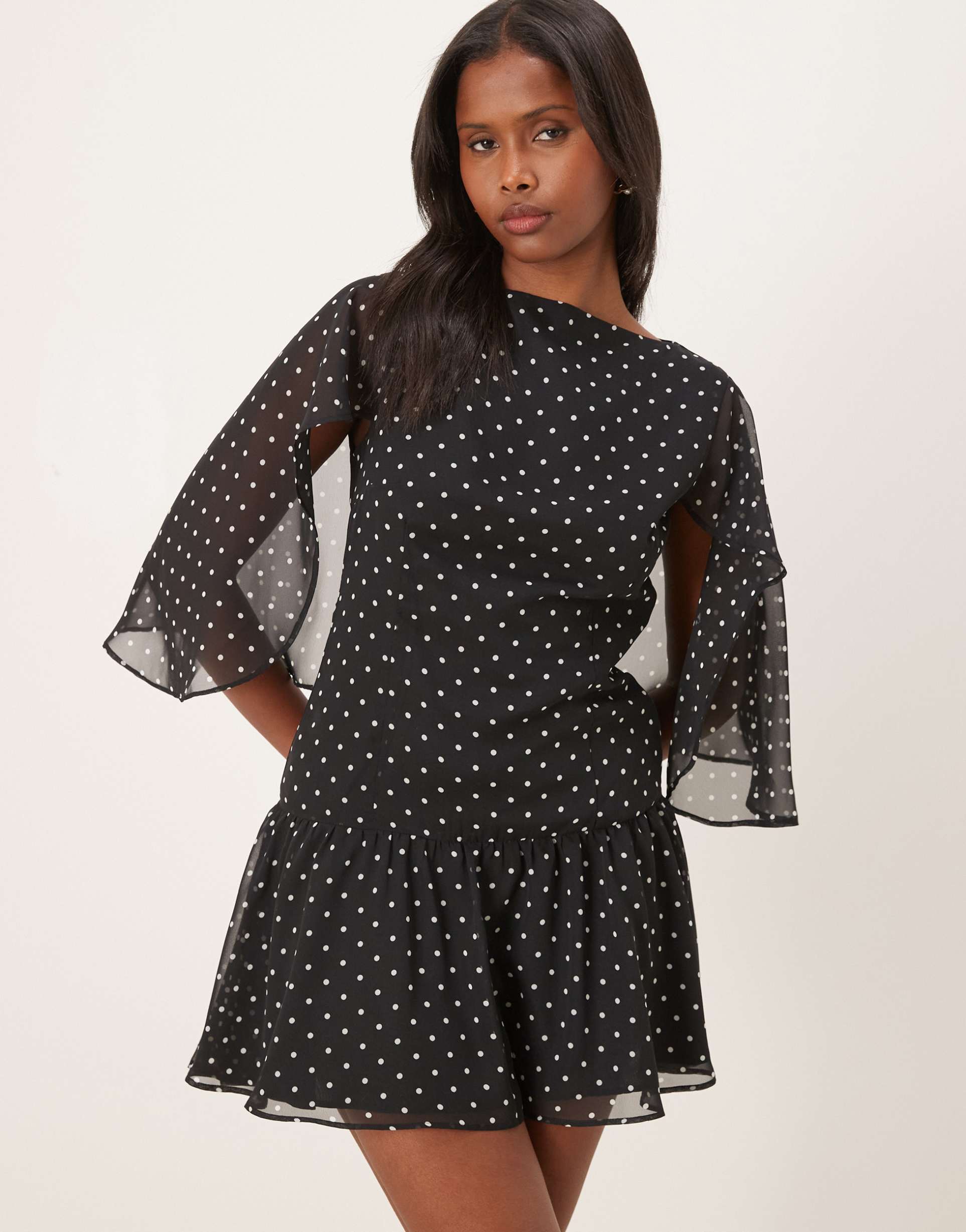 ASOS DESIGN CHIFFON CAPE DETAIL MINI DRESS IN BLACK POLKA DOT