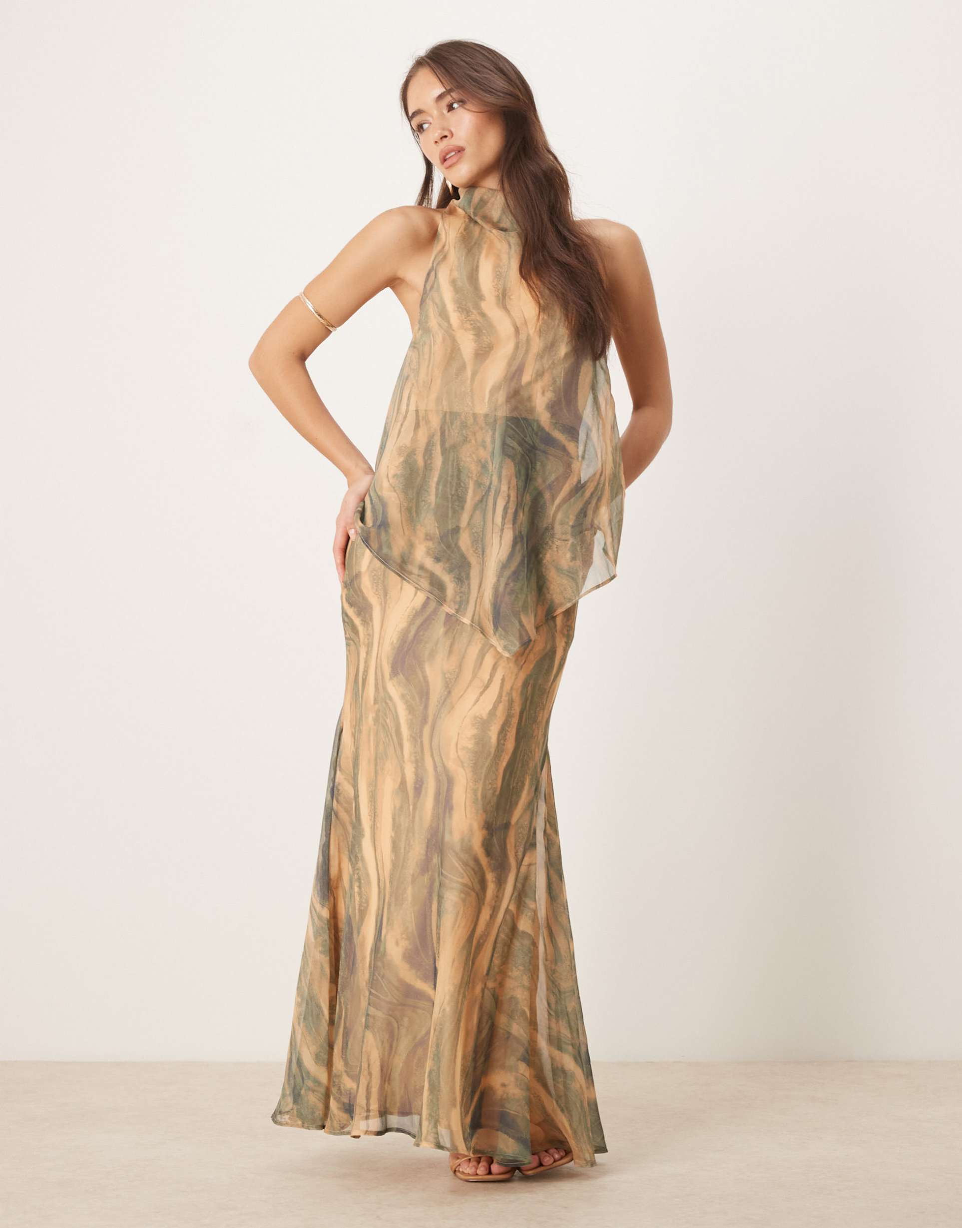 ASOS DESIGN CHIFFON HIGH NECK DOUBLE LAYER MAXI DRESS IN MARBLE PRINT