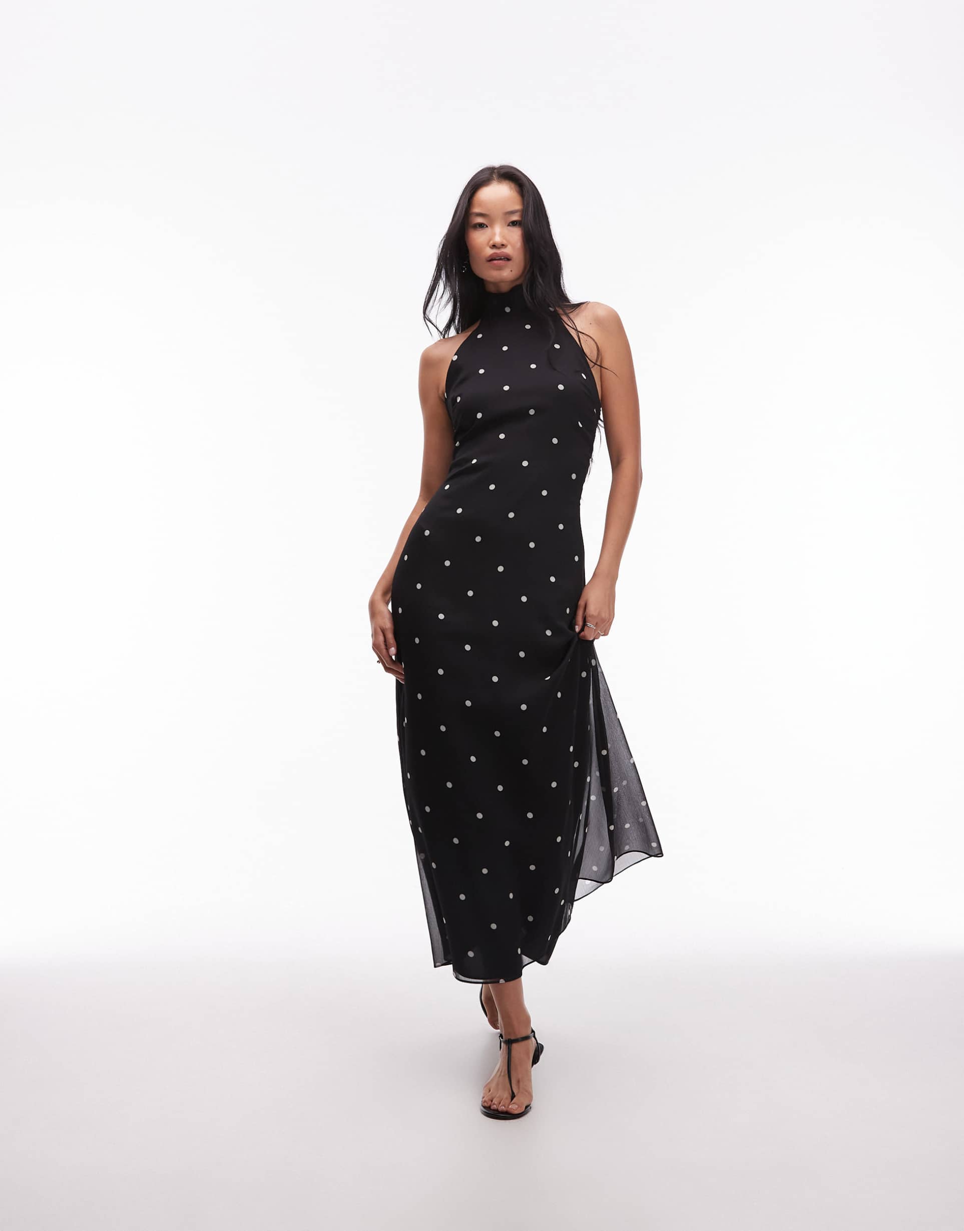 ASOS DESIGN CHIFFON HIGH NECK MAXI DRESS IN BLACK POLKA DOT