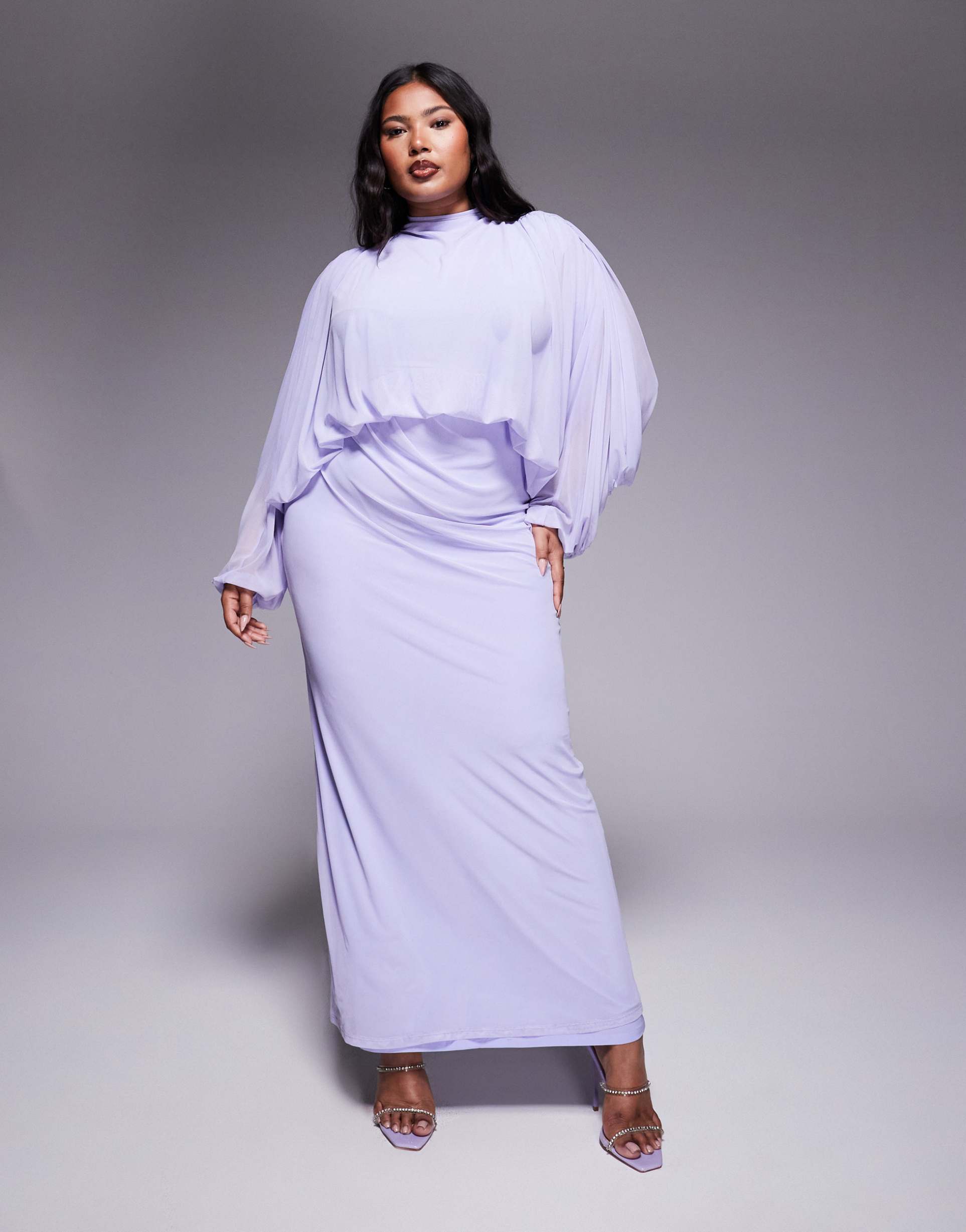 ASOS DESIGN CURVE MESH DRAPED BLOUSON LONG SLEEVE MAXI DRESS WITH RUCHED SKIRT IN LILAC