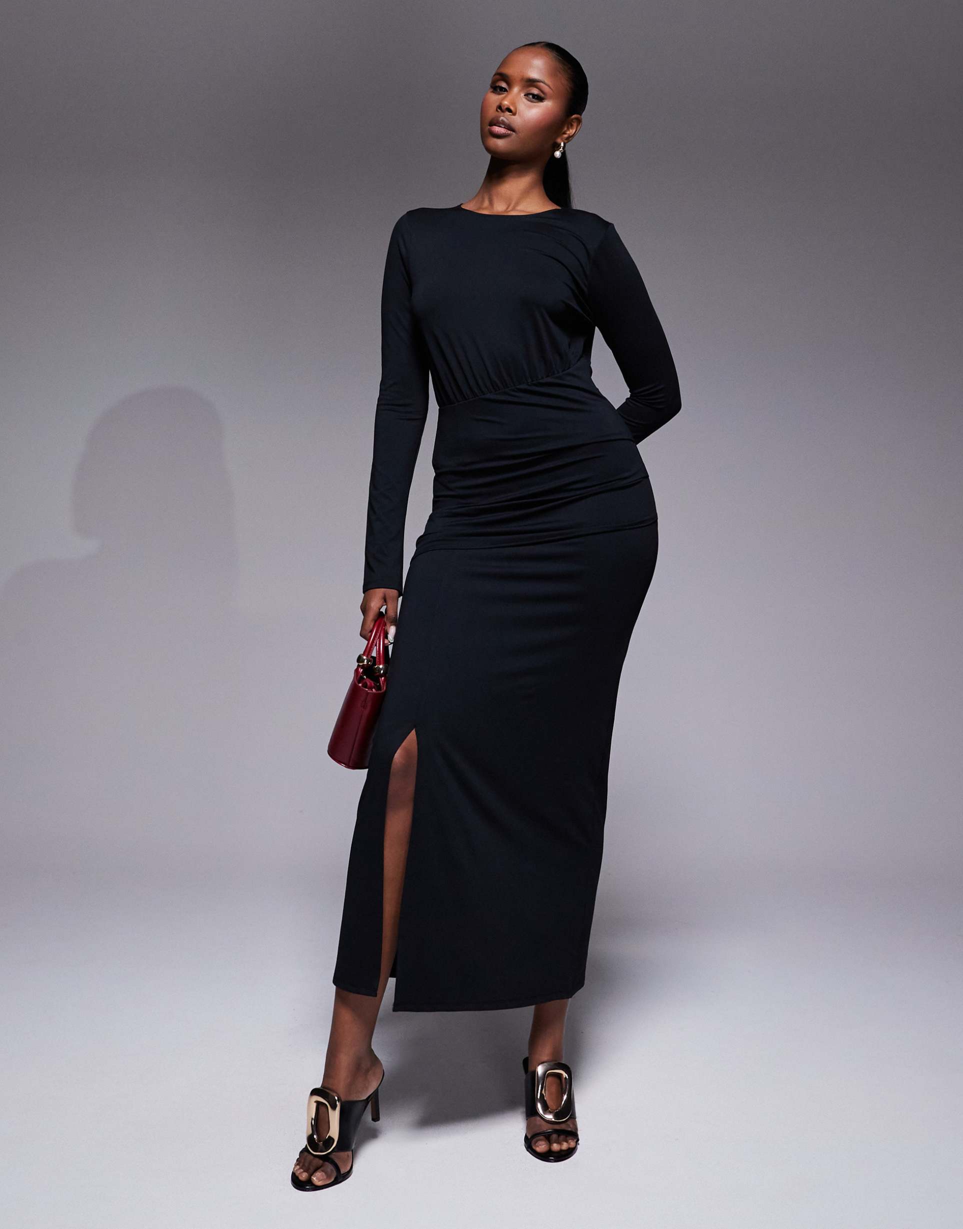 ASOS DESIGN CINCHED WAIST FRONT SLIT DETAIL MAXI DRESS IN BLACK