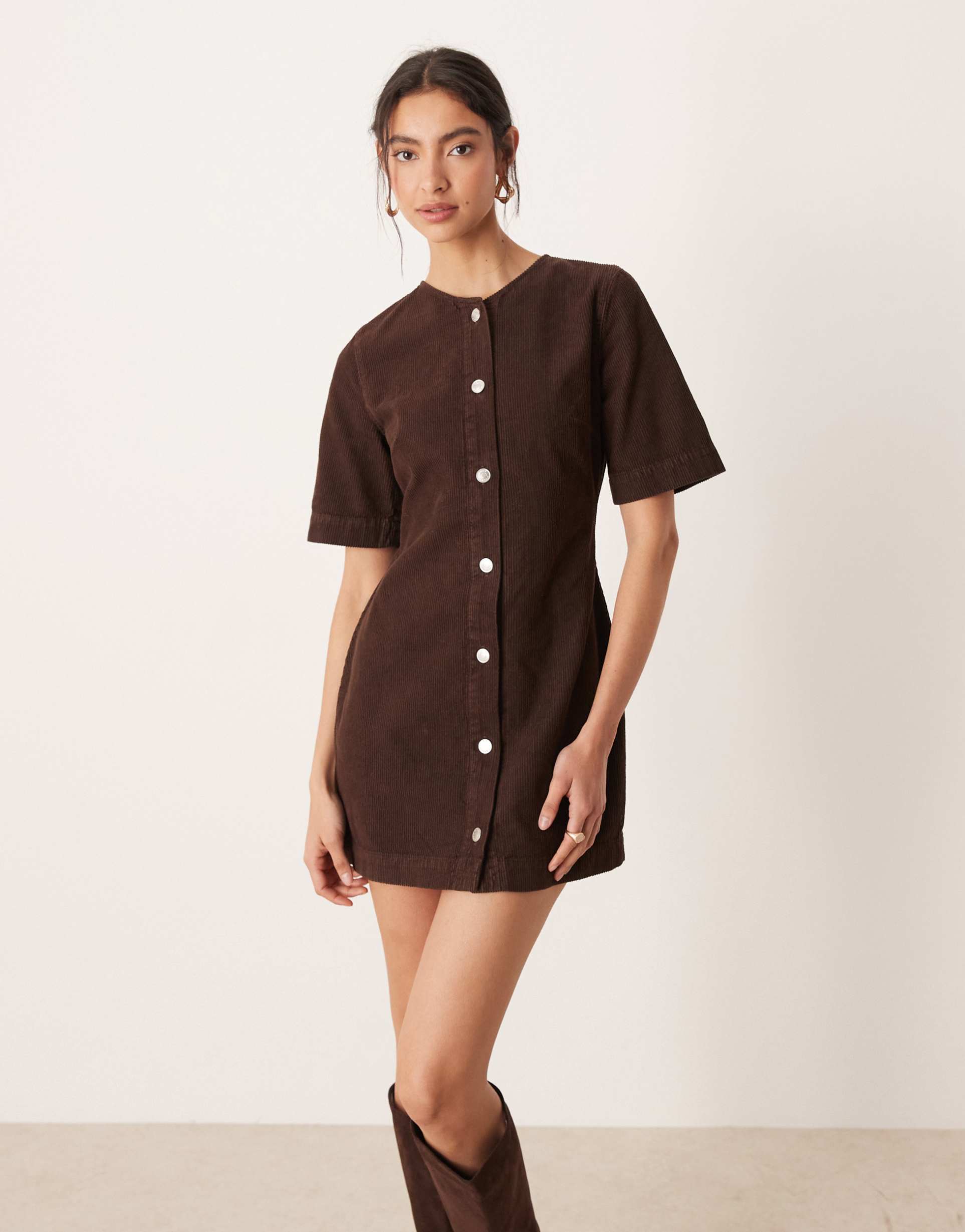 ASOS DESIGN CORDUROY BUTTON THROUGH MINI DRESS IN CHOCOLATE BROWN