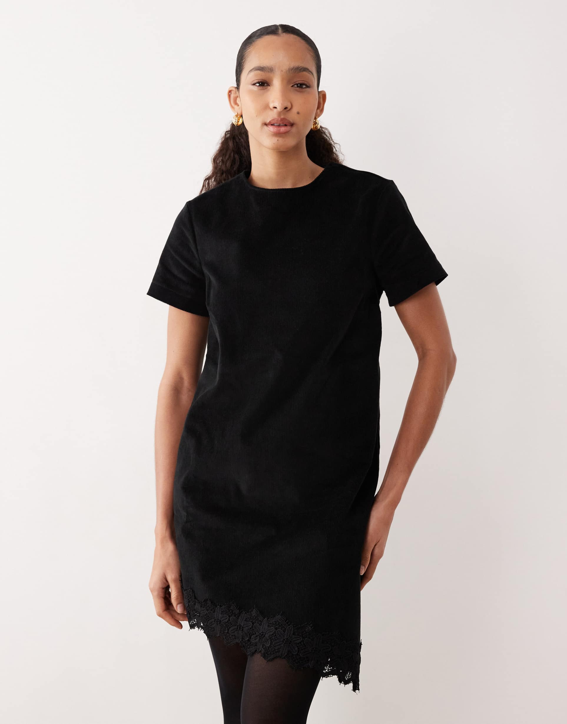 ASOS DESIGN CORDUROY T-SHIRT MIDI DRESS WITH ASYMMETRIC LACE HEM IN BLACK