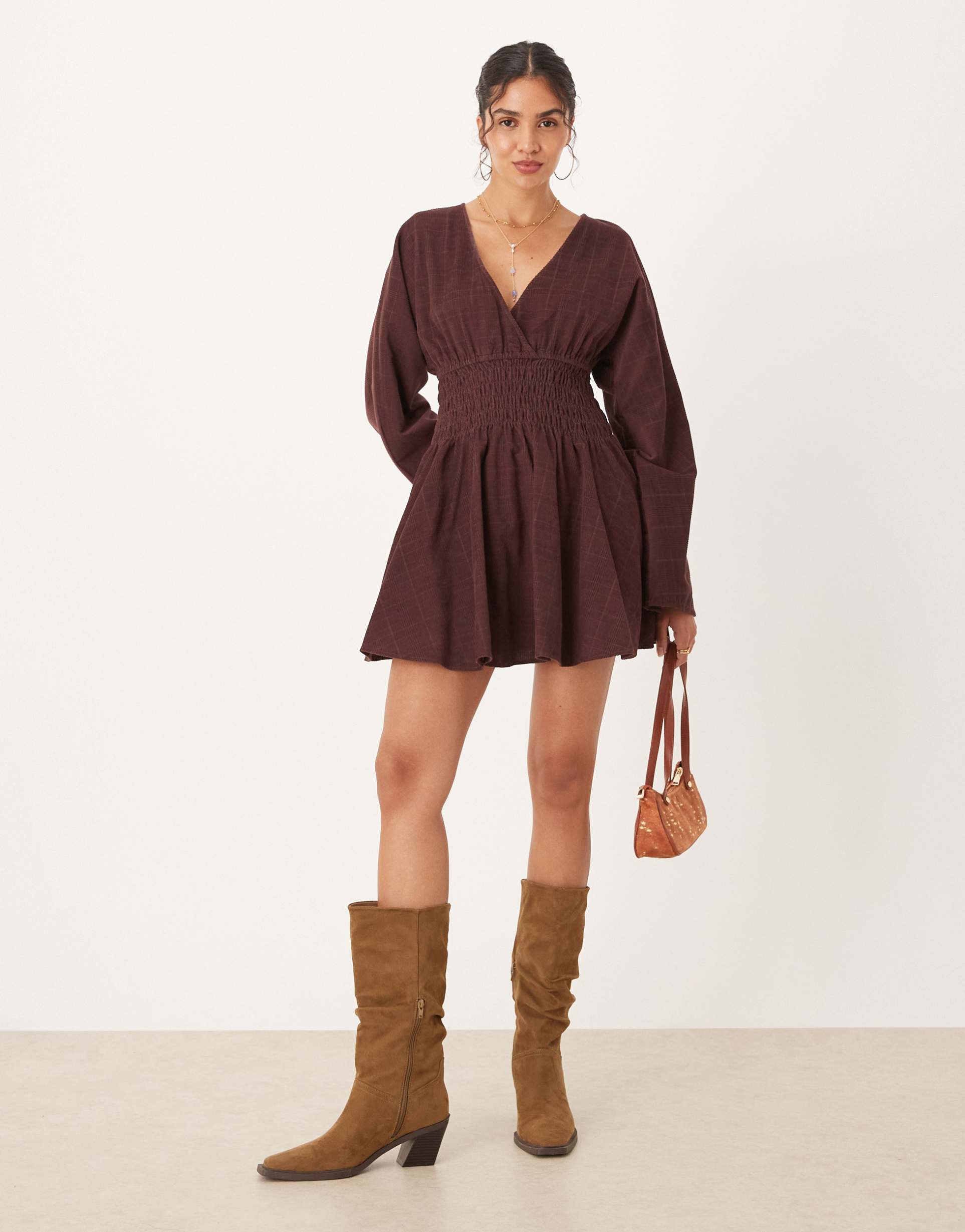 ASOS DESIGN CORDUROY V NECK MINI DRESS WITH SHIRRED WAIST IN MULBERRY