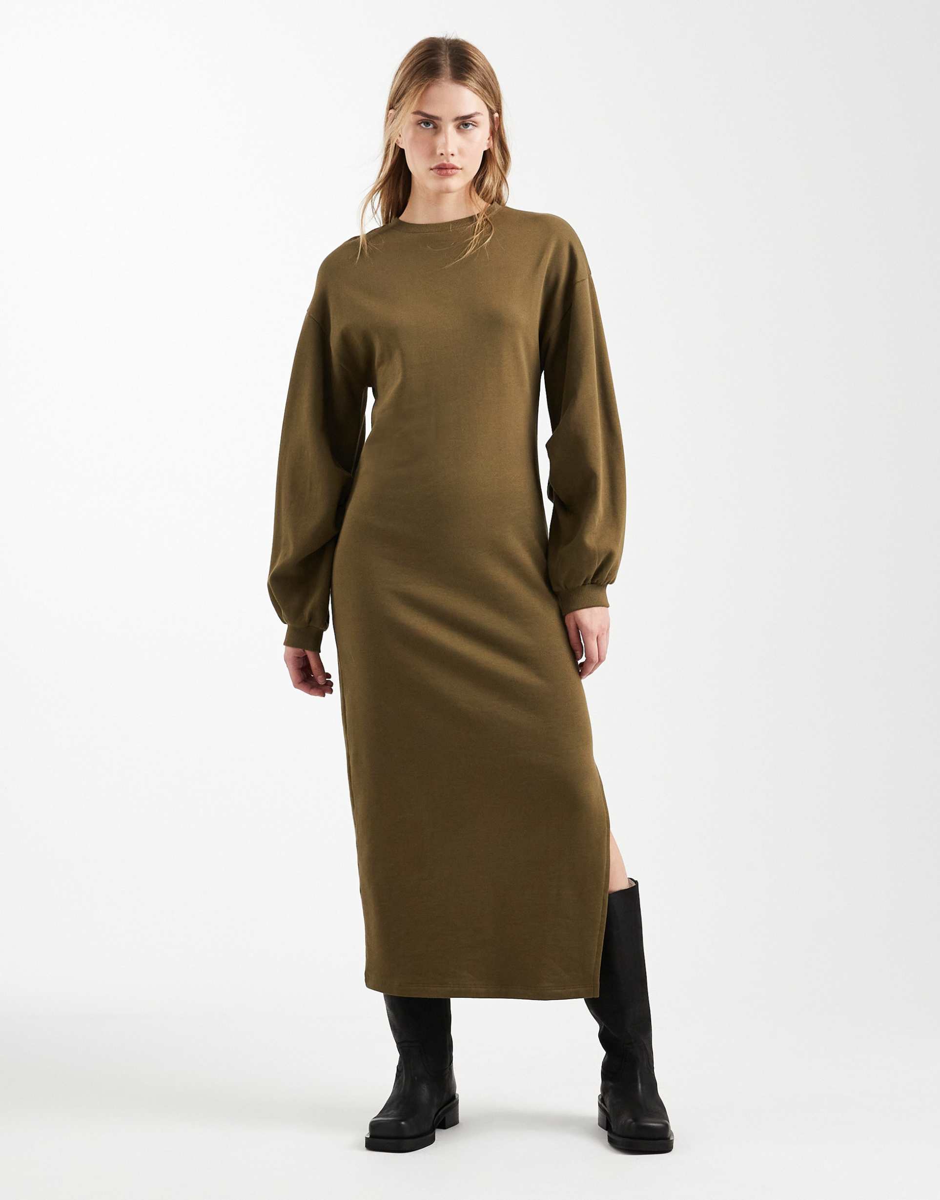 Soft cotton fabric with a cozy raised texture and balloon sleeves combine to create a comfortable yet stylish midi sweater dress in an earthy olive tone. The crew neckline and ribbed cuffs add subtle structure, while a side slit and clean hemline give ease of movement and a modern edge. Its regular fit offers everyday comfort, making it perfect for casual outings, workwear, or travel during cooler seasons. This minimalist, casual chic piece pairs effortlessly with boots for a laid-back yet polished look.