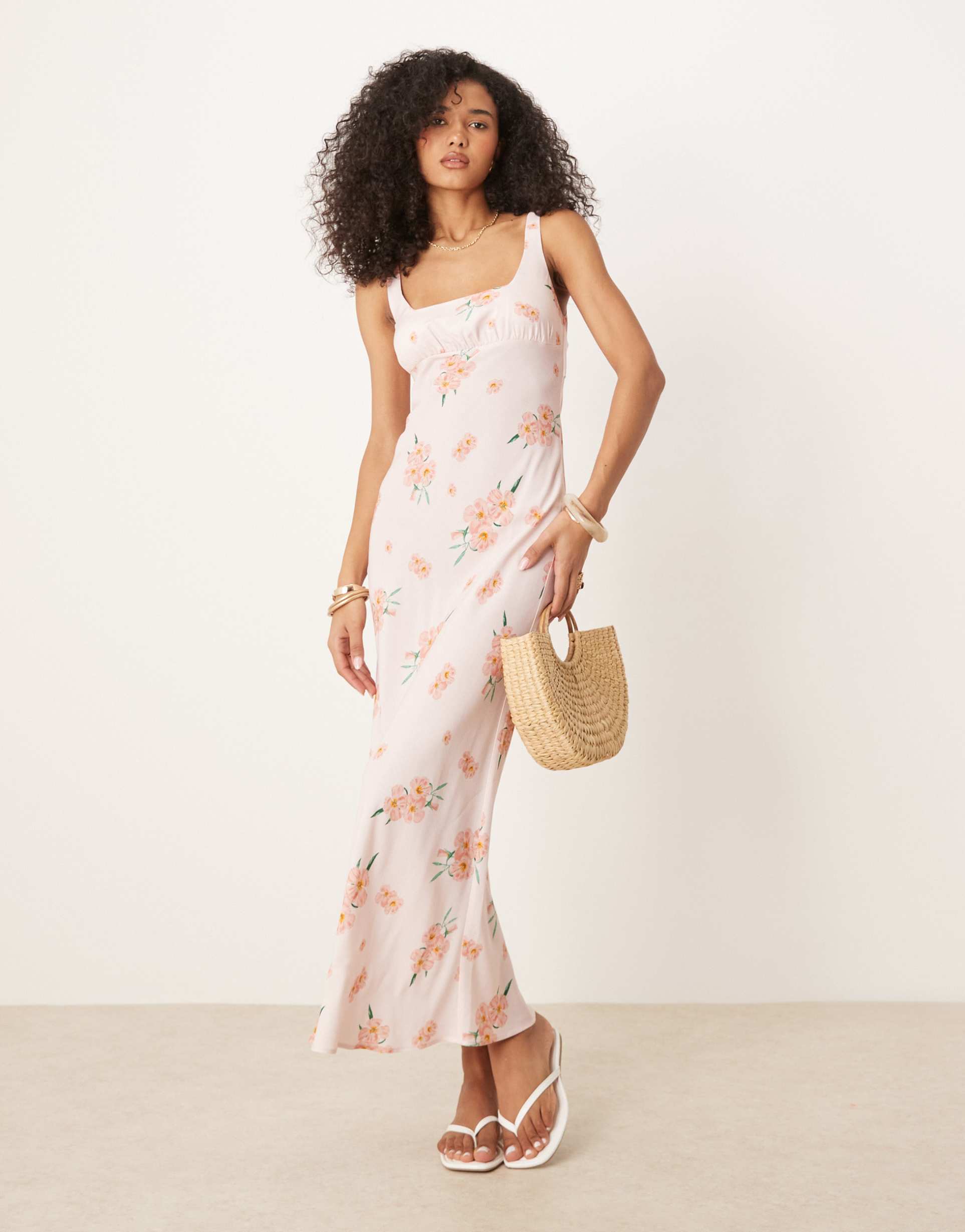 Soft viscose fabric and a figure-skimming slip dress silhouette showcase a floral print on a cream base. The square neckline and wide straps provide a classic touch, while the tie-back fastening and ruched bust add subtle allure. Falling to a maxi length with a clean hemline, this romantic and casual chic dress is perfect for spring and summer occasions such as brunch, casual outings, or date nights.