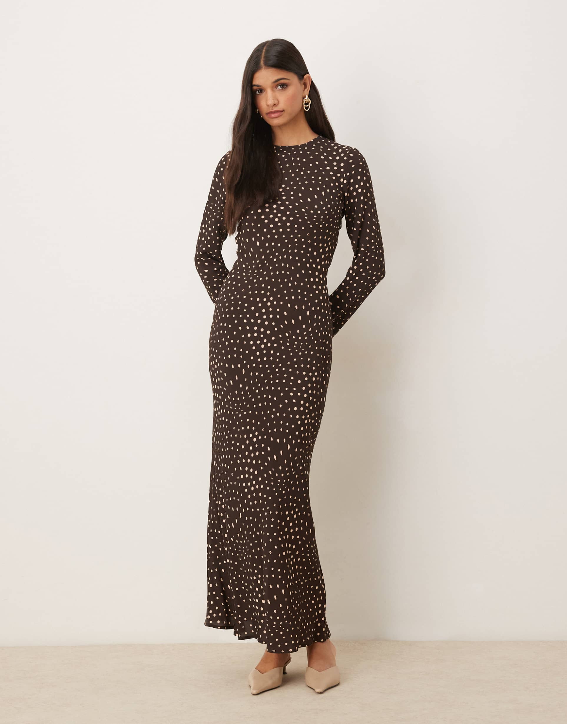 ASOS DESIGN CREW NECK LONG SLEEVE MAXI DRESS IN BROWN DOT
