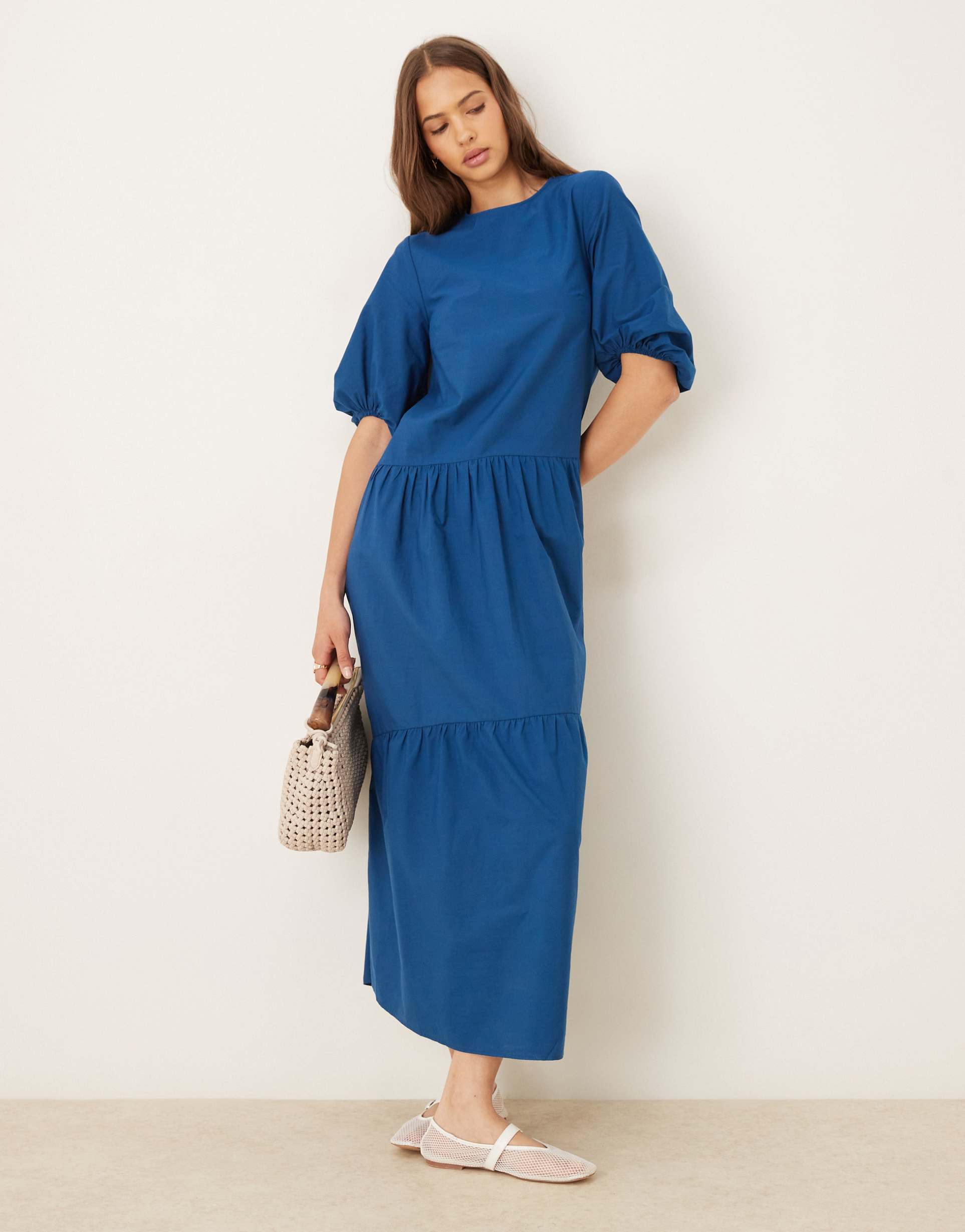 ASOS DESIGN CREW NECK PUFF SLEEVE TIERED MAXI DRESS IN NAVY