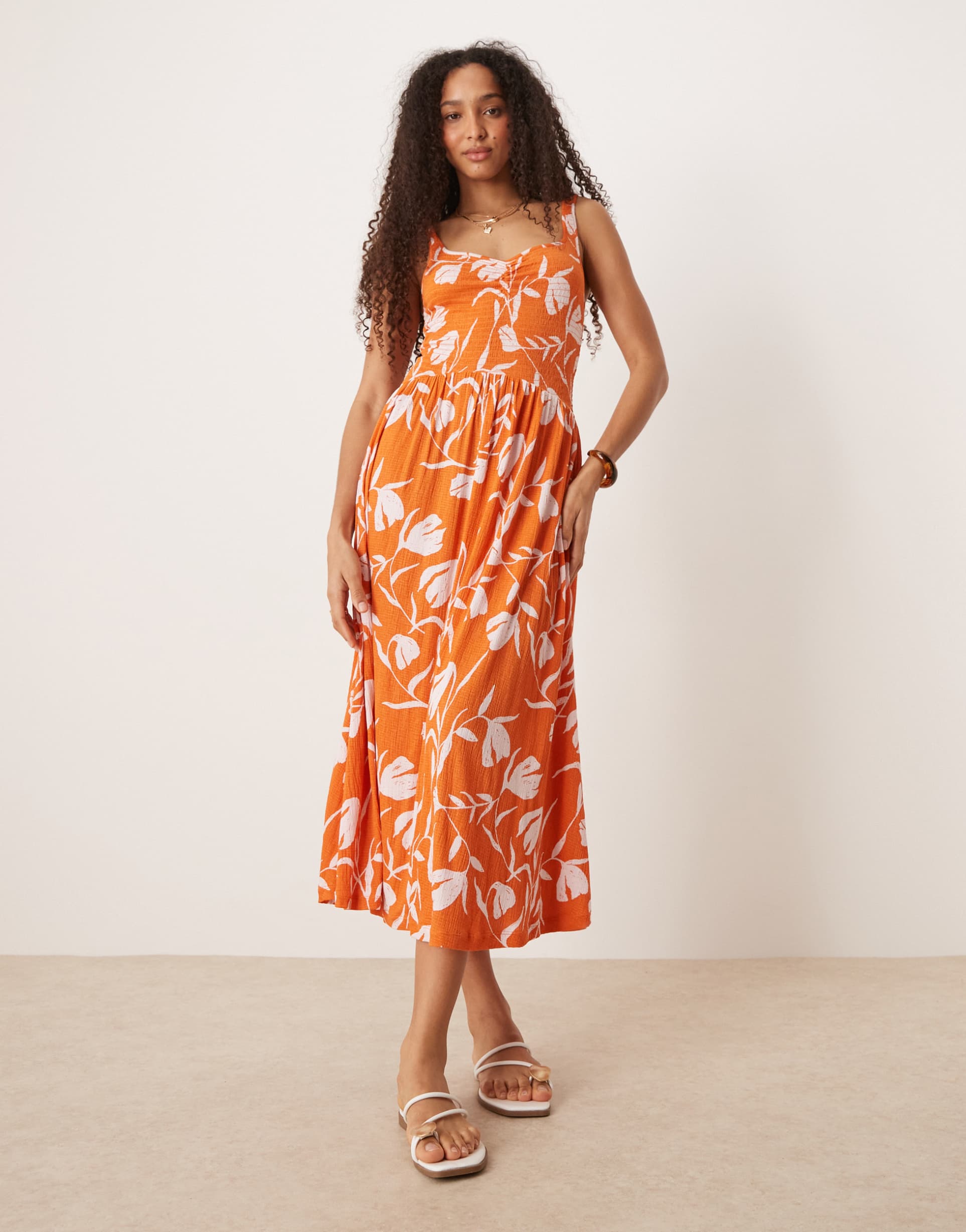ASOS DESIGN CRINKLE SWEETHEART NECK MIDI DRESS IN ORANGE AND WHITE FLORAL PRINT
