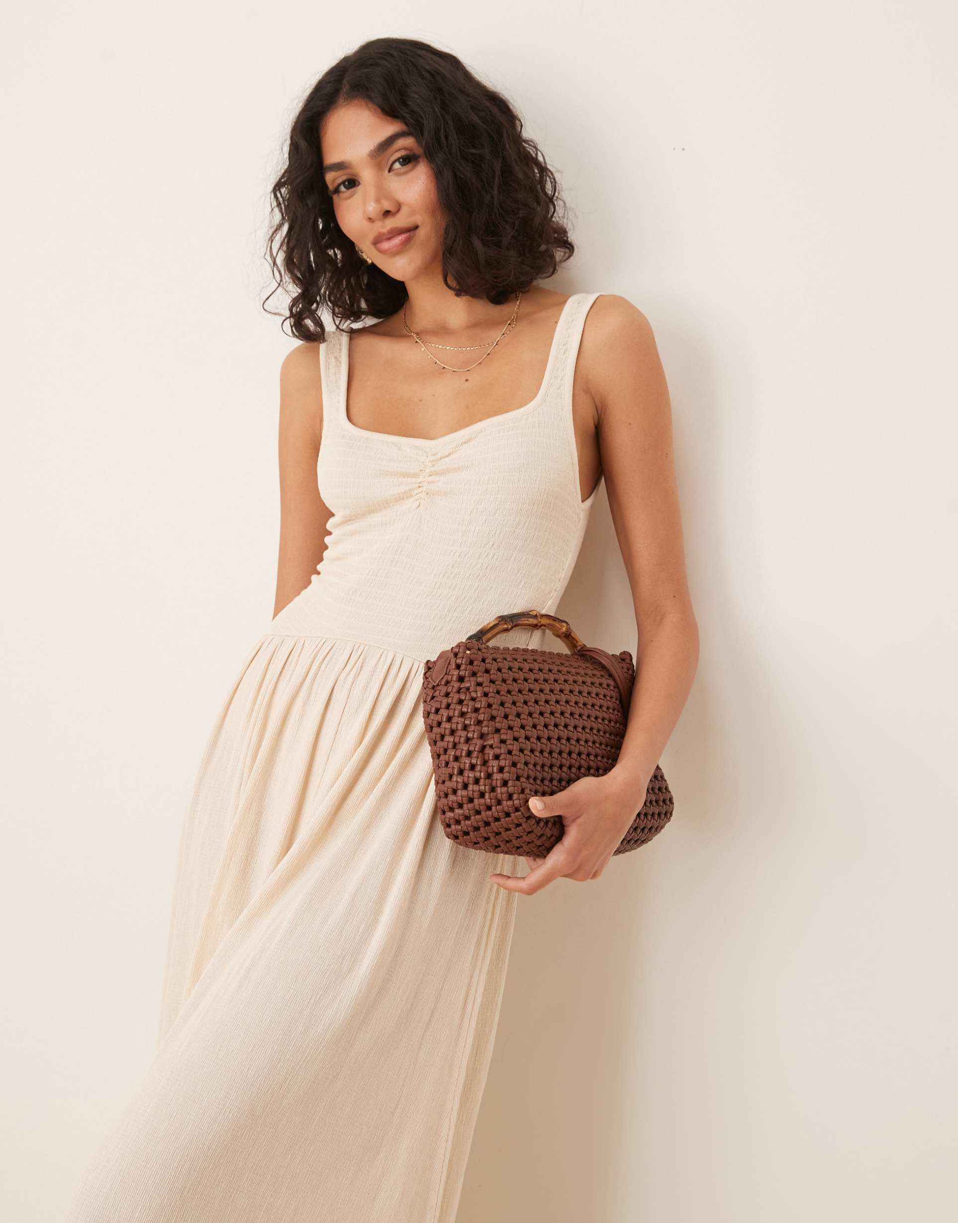 ASOS DESIGN CRINKLE SWEETHEART NECK MIDI DRESS IN STONE