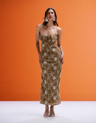 ASOS DESIGN CROCHET BANDEAU TWIST MIDI DRESS WITH FLORAL EMBROIDERY IN BEIGE