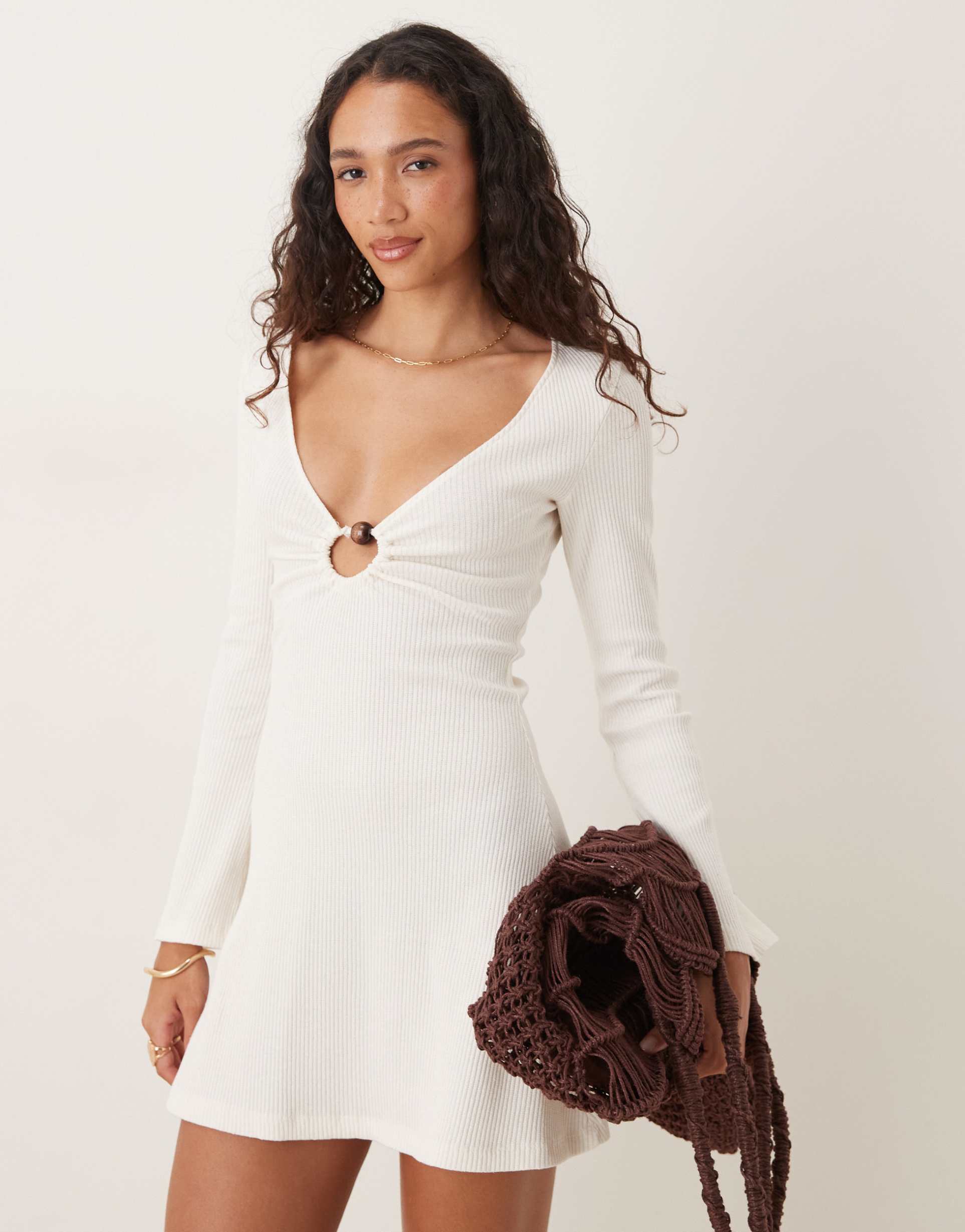 ASOS DESIGN CROCHET LONG SLEEVE HARDWARE DETAIL MINI DRESS IN NEUTRAL