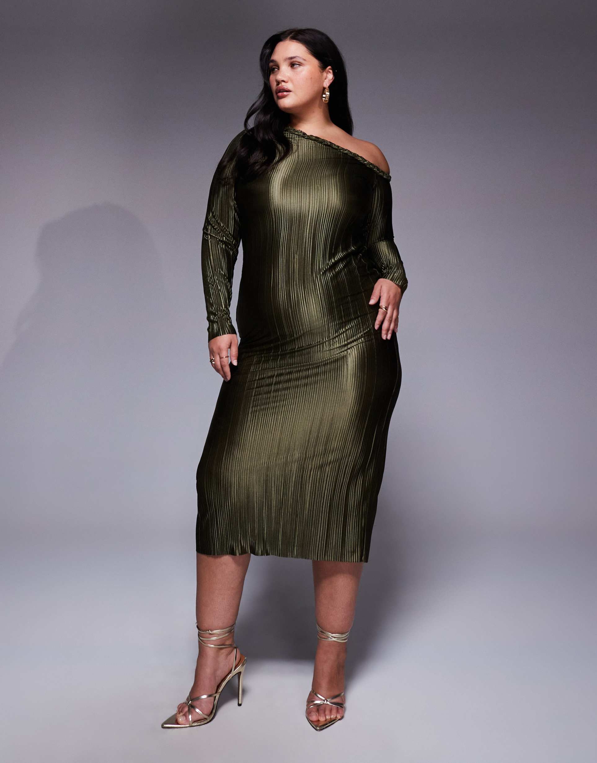 ASOS DESIGN CURVE BRAIDED NECKLINE PLISSE MIDI DRESS IN KHAKI GREEN