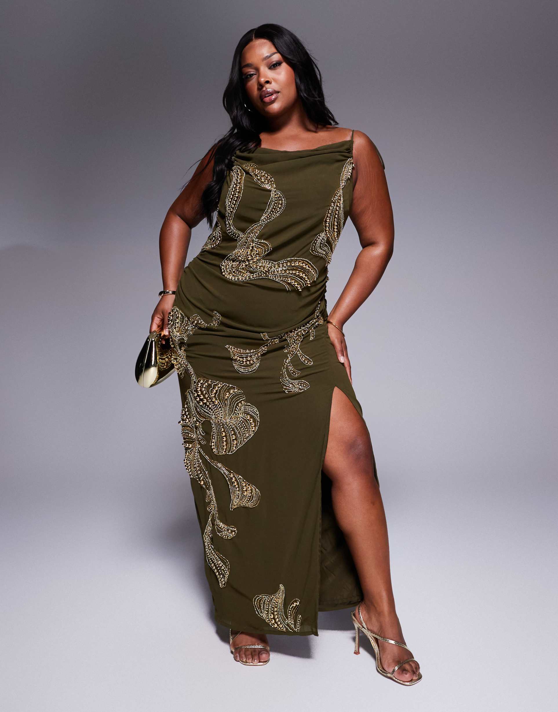 Soft chiffon fabric and a flattering slim fit define this elegant maxi slip dress in matte olive. The draped cowl neckline and tie straps add graceful detail, while embroidered embellishments on the front and skirt elevate its sophisticated style. A daring side slit enhances movement and allure. Perfect for spring through autumn evenings, this plus size piece suits cocktail parties, date nights, and night outs with ease.