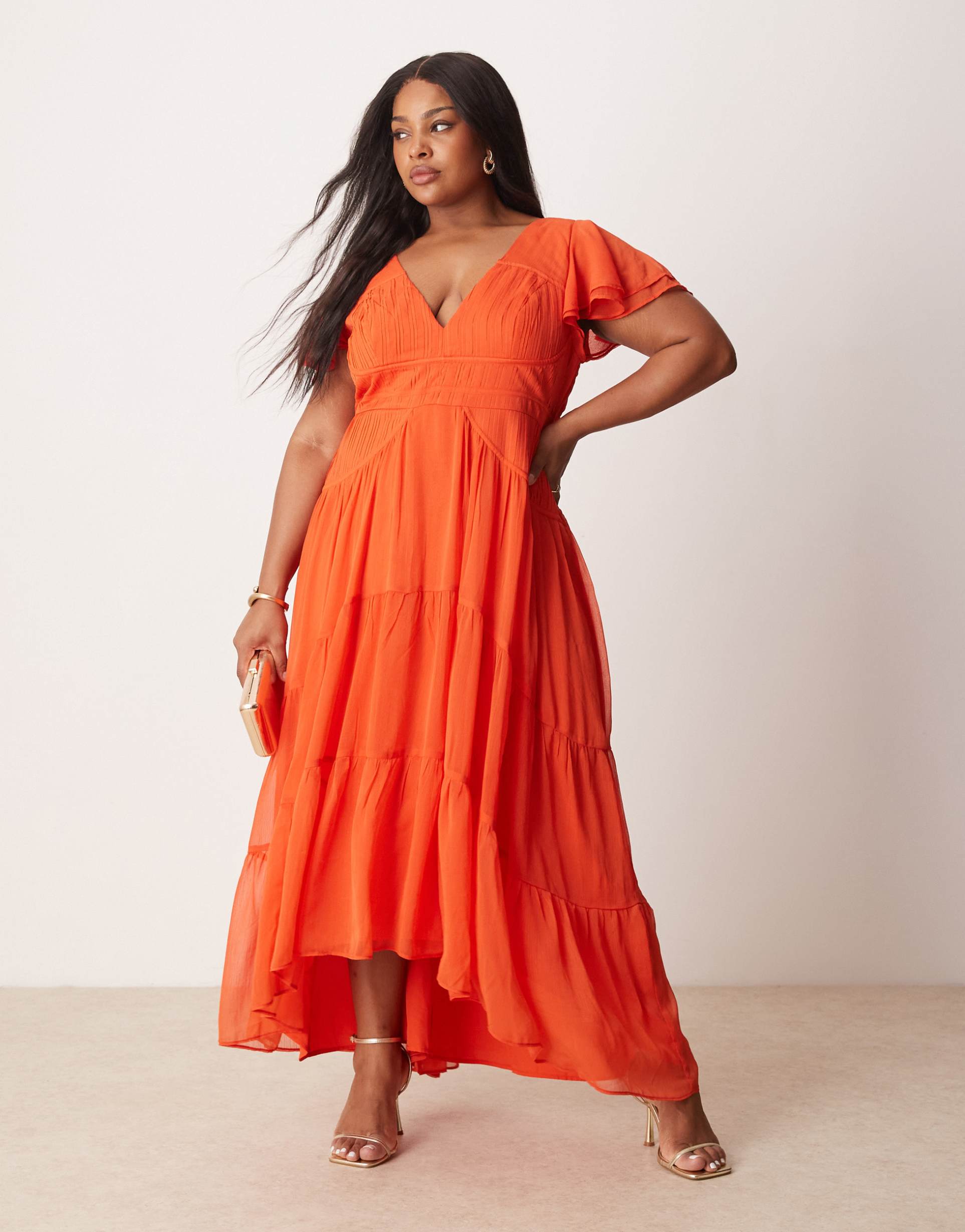 ASOS DESIGN CURVE FLUTTER SLEEVE RUCHED MAXI DRESS WITH HI LOW HEM IN SPICY RED