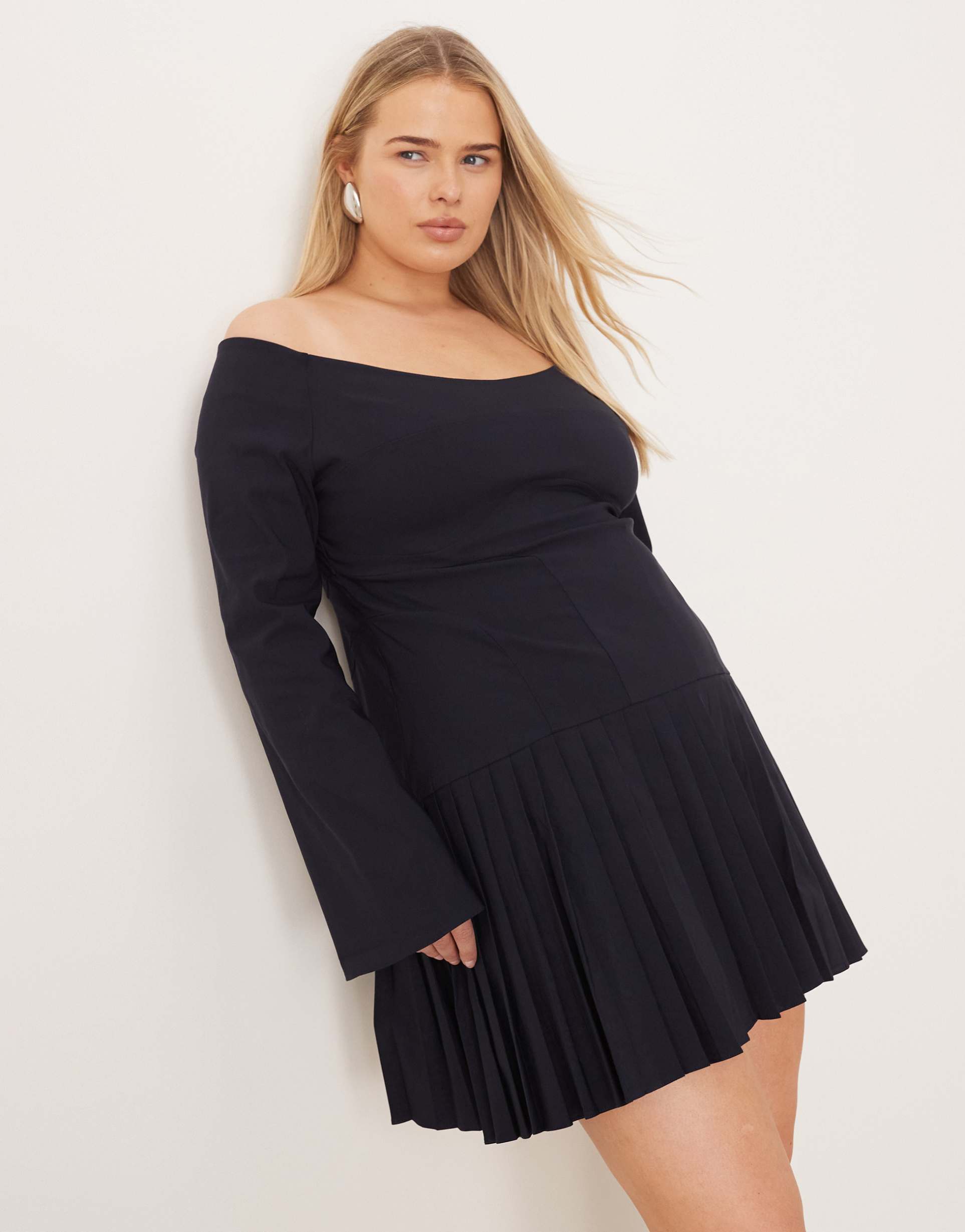 Softly structured in a matte navy fabric blend of viscose, nylon, and elastane, this mini dress features an elegant off-shoulder neckline paired with long sleeves for a sophisticated edge. The regular fit skims the body comfortably while the pleated skirt adds movement and texture, creating a timeless shift silhouette. Ideal for casual outings, brunches, or date nights, its clean hemline and classic style ensure versatile wear across seasons. Designed for plus size figures, this dress blends minimalist charm with refined details for effortless everyday elegance.