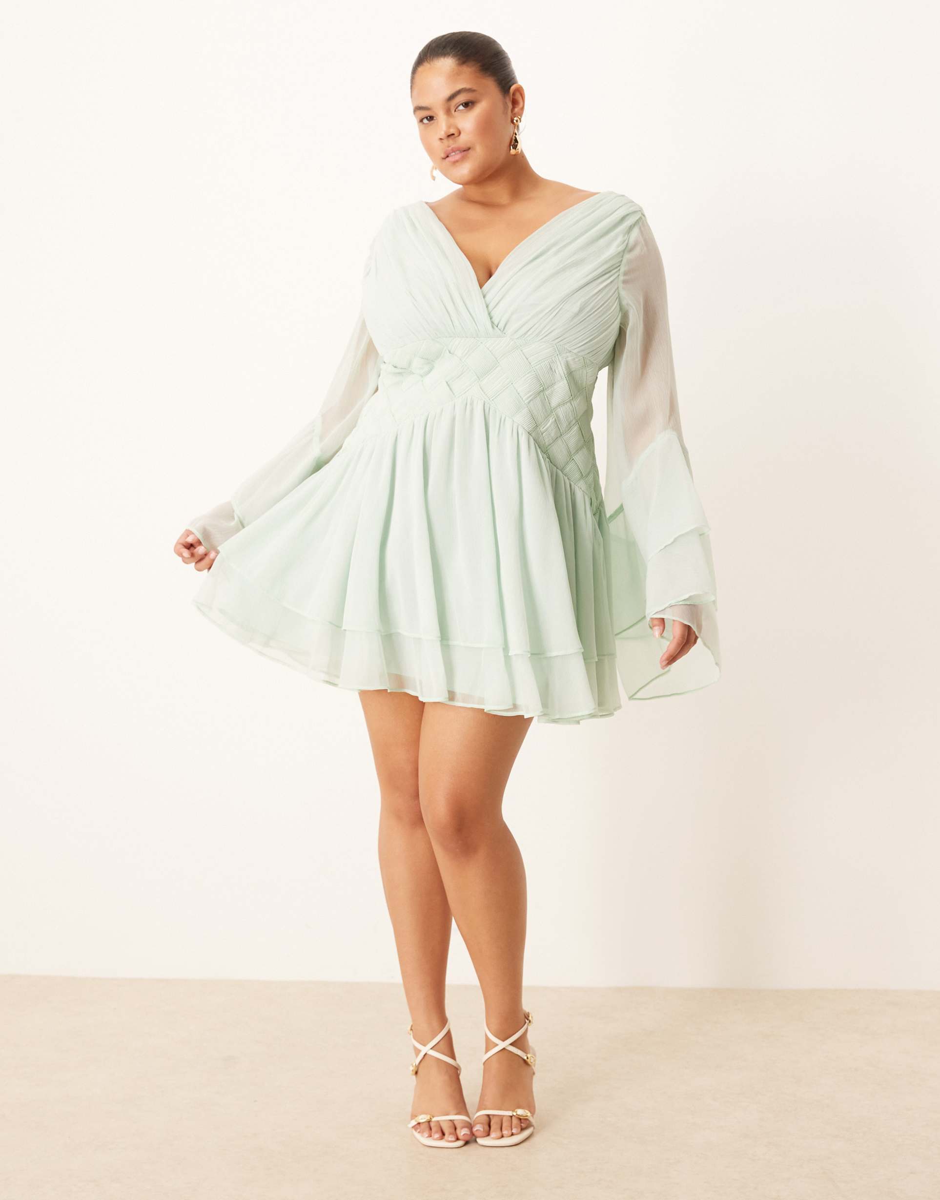 ASOS DESIGN CURVE LONG SLEEVE VOLUME MINI DRESS WITH LATTICE WAIST DETAILING IN PALE BLUE