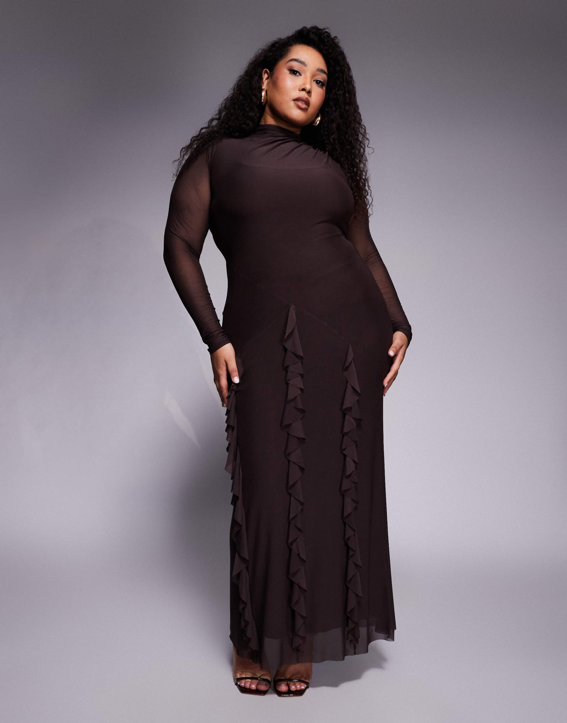 ASOS DESIGN CURVE MESH LONG SLEEVE MAXI DRESS WITH WATERFALL RUFFLE SKIRT DETAIL IN CHOCOLATE