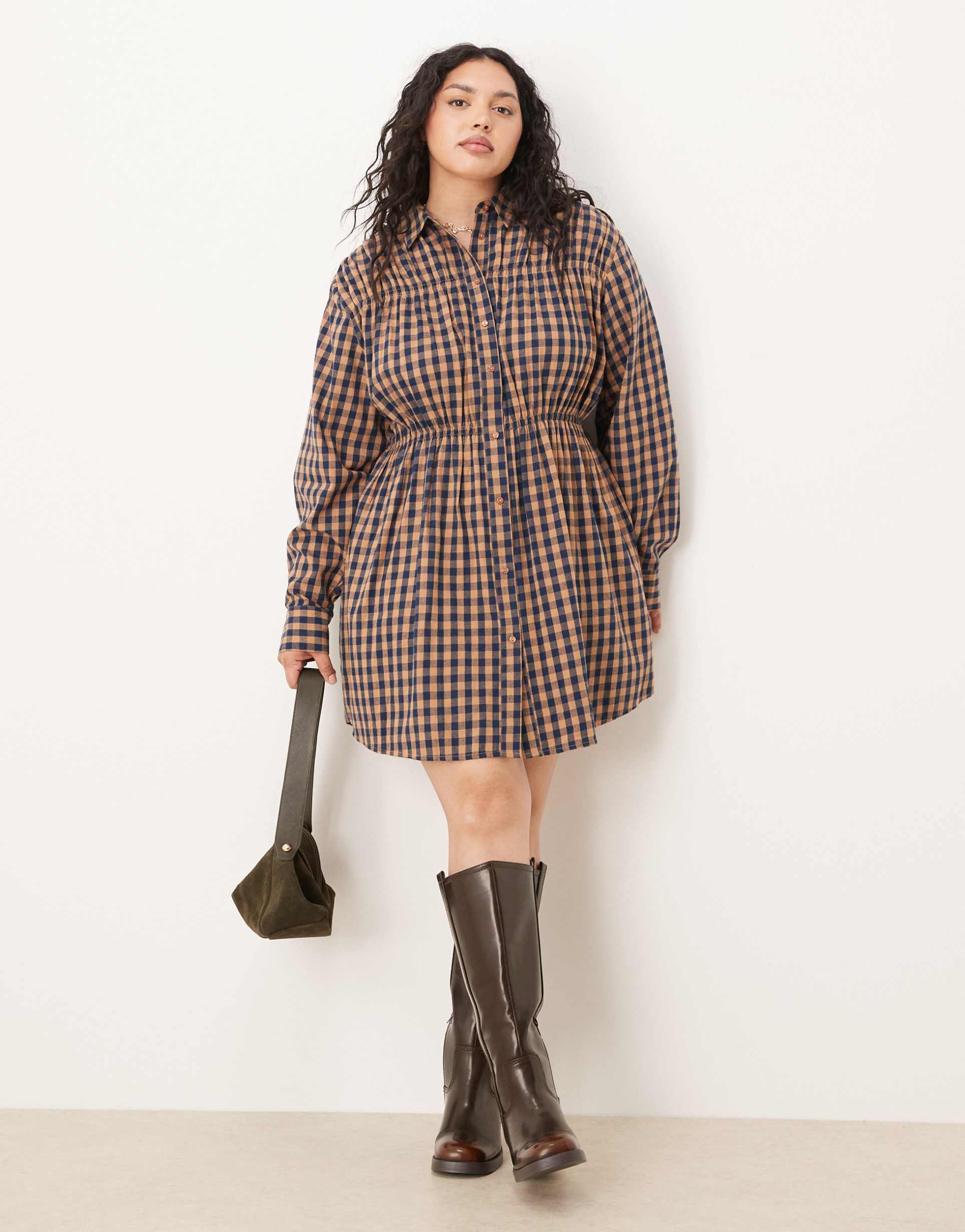 ASOS DESIGN CURVE SHIRT MINI DRESS WITH CINCHED WAIST IN TAN PLAID