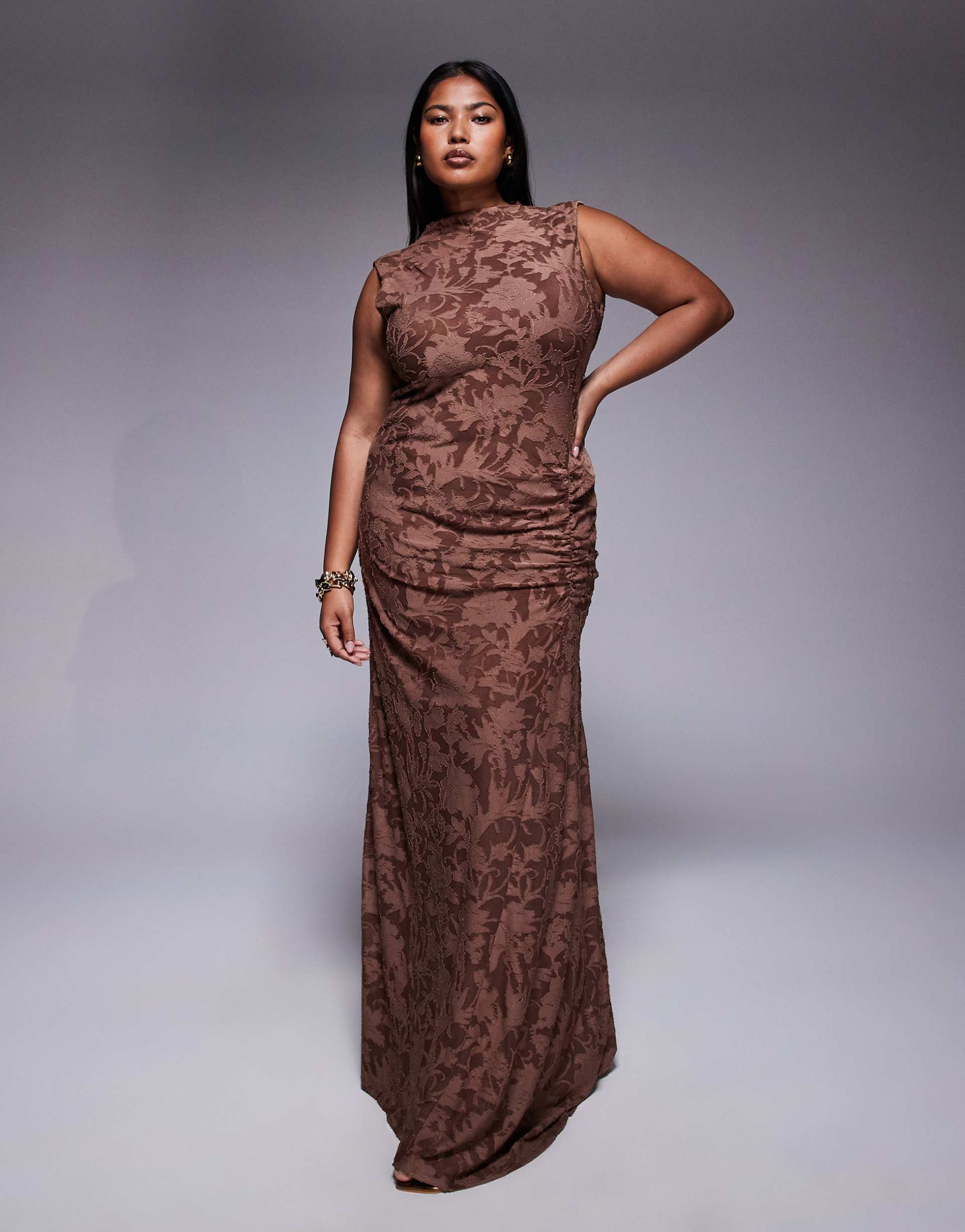 ASOS DESIGN CURVE SLEEVELESS HIGH NECK DEVORE MAXI DRESS WITH RUCHED SKIRT DETAIL IN CHOCOLATE