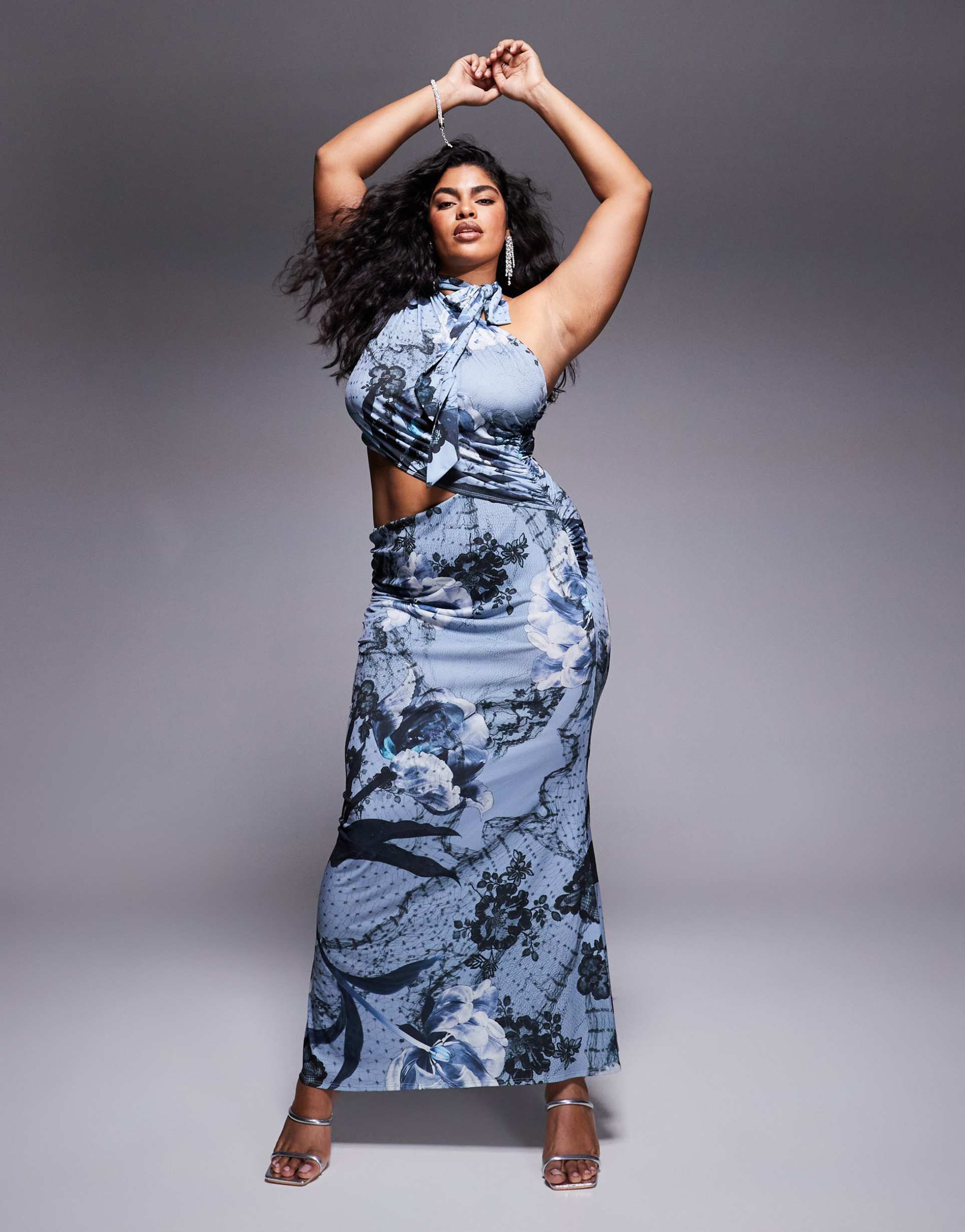 ASOS DESIGN CURVE SLEEVELESS HIGH NECK MAXI DRESS IN BLUE FLORAL PRINT