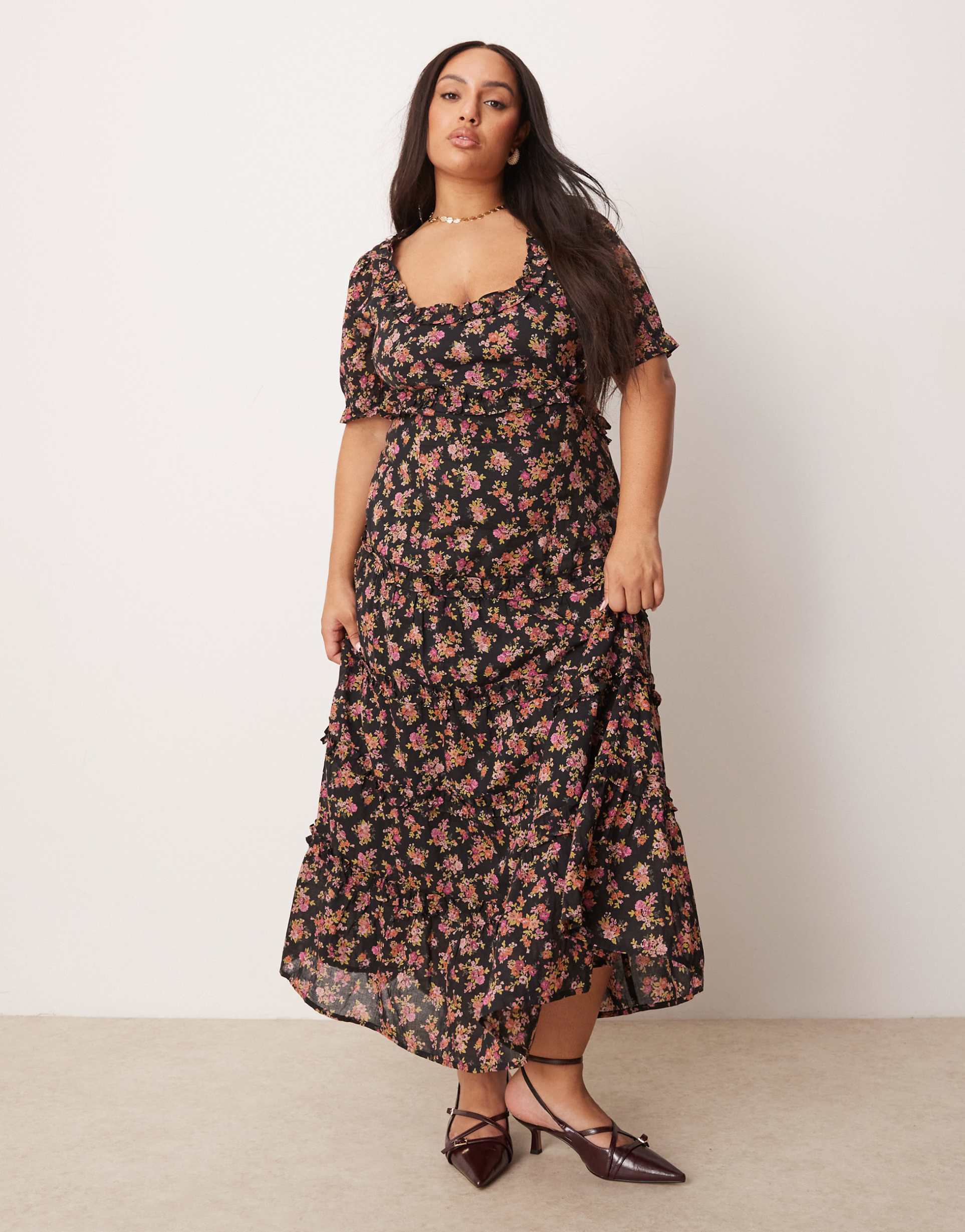 ASOS DESIGN CURVE SWEETHEART NECKLINE MIDI DRESS WITH CUT OUT IN DARK BASE FLORAL