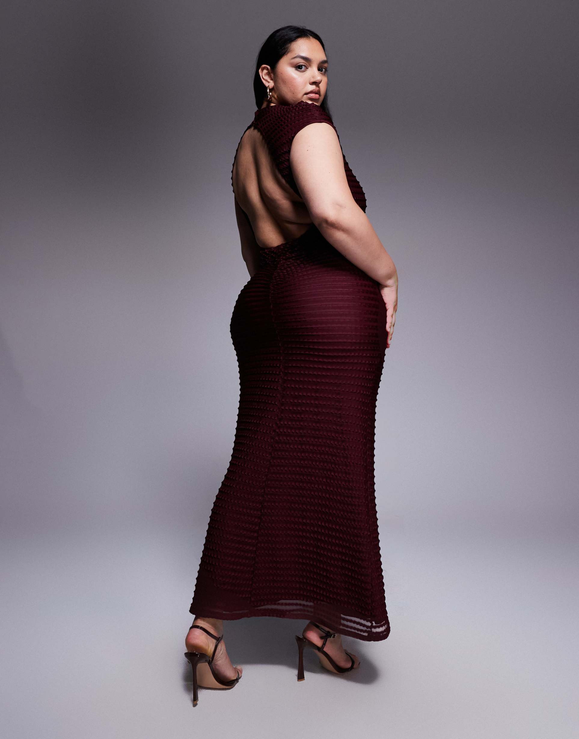 A figure-flattering sheath silhouette meets a textured mesh fabric in this cherry maxi dress, featuring a sophisticated high neckline and delicate cap sleeves. The open back with button-keyhole detail adds an alluring touch, perfect for elegant evenings and cocktail parties. Designed with a slim fit that enhances curves, this plus size maxi is crafted from soft, stretchy polyester-elastane blend for comfort and style. Its clean hemline and timeless color make it a versatile choice for date nights, night outs, and special occasions.