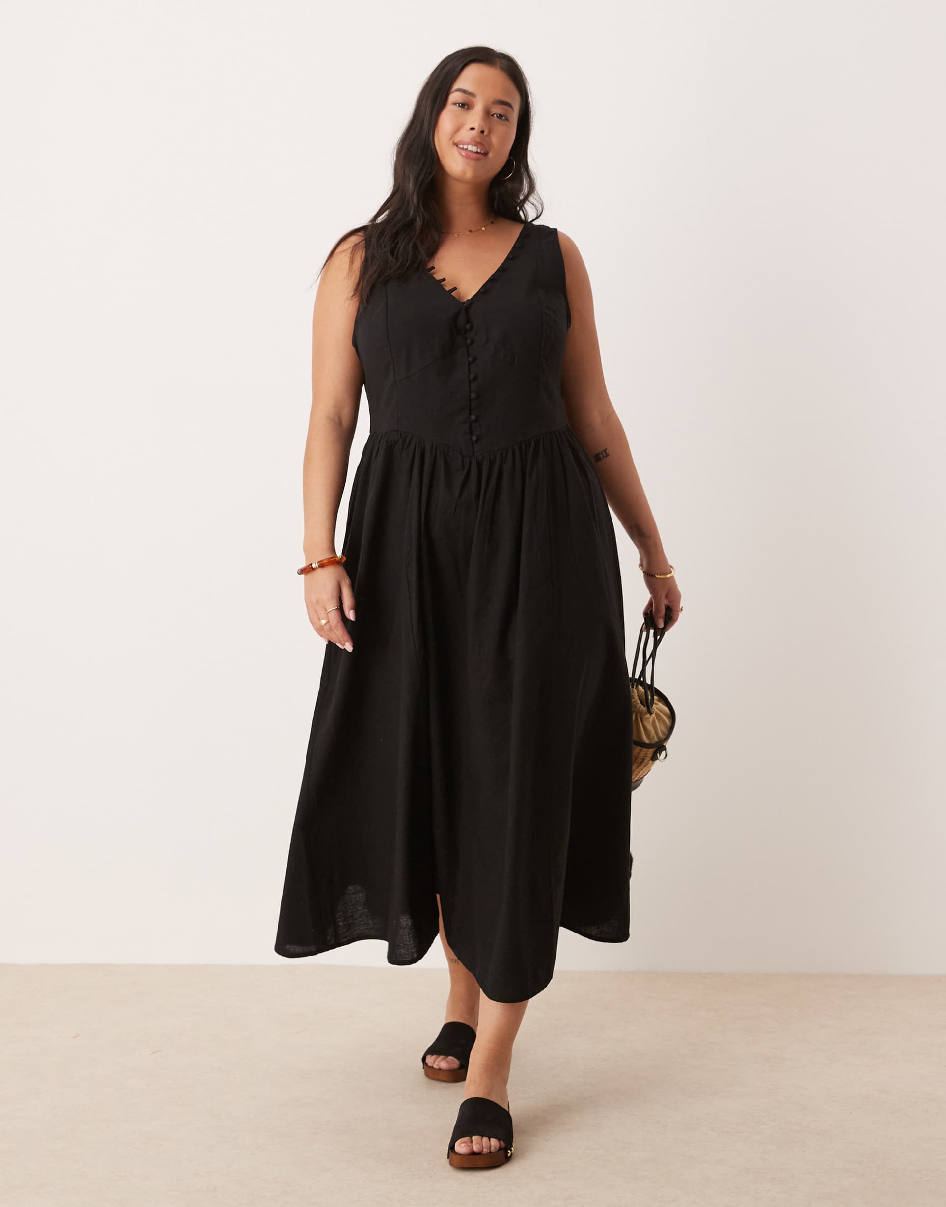 ASOS DESIGN CURVE V NECK BUTTON UP MAXI DRESS WITH DROPPED WAIST IN BLACK