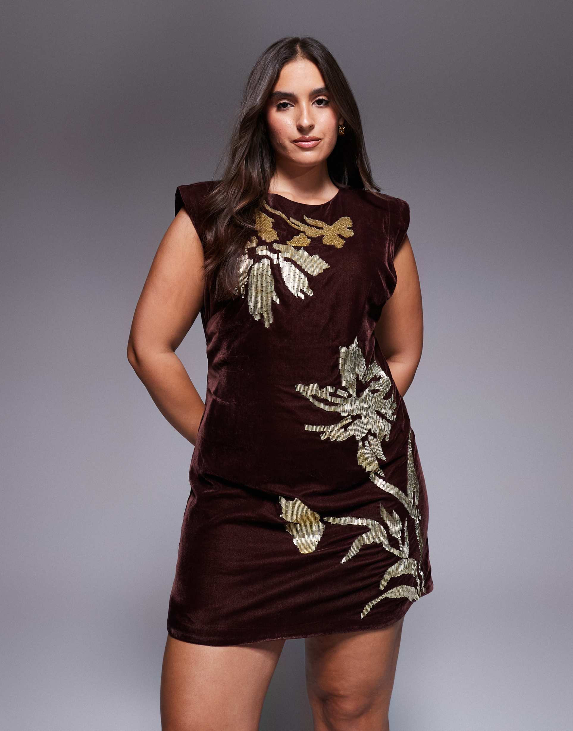 ASOS DESIGN CURVE VELVET SHOULDER PAD MINI DRESS WITH FLORAL EMBELLISHMENT IN MULBERRY