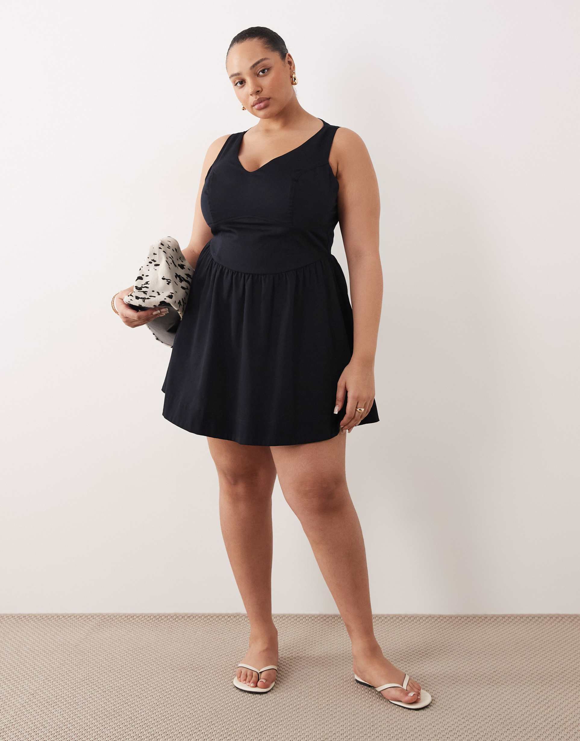 ASOS DESIGN CURVE WAISTED V NECK MINI SUNDRESS WITH SEAMING DETAILS IN BLACK