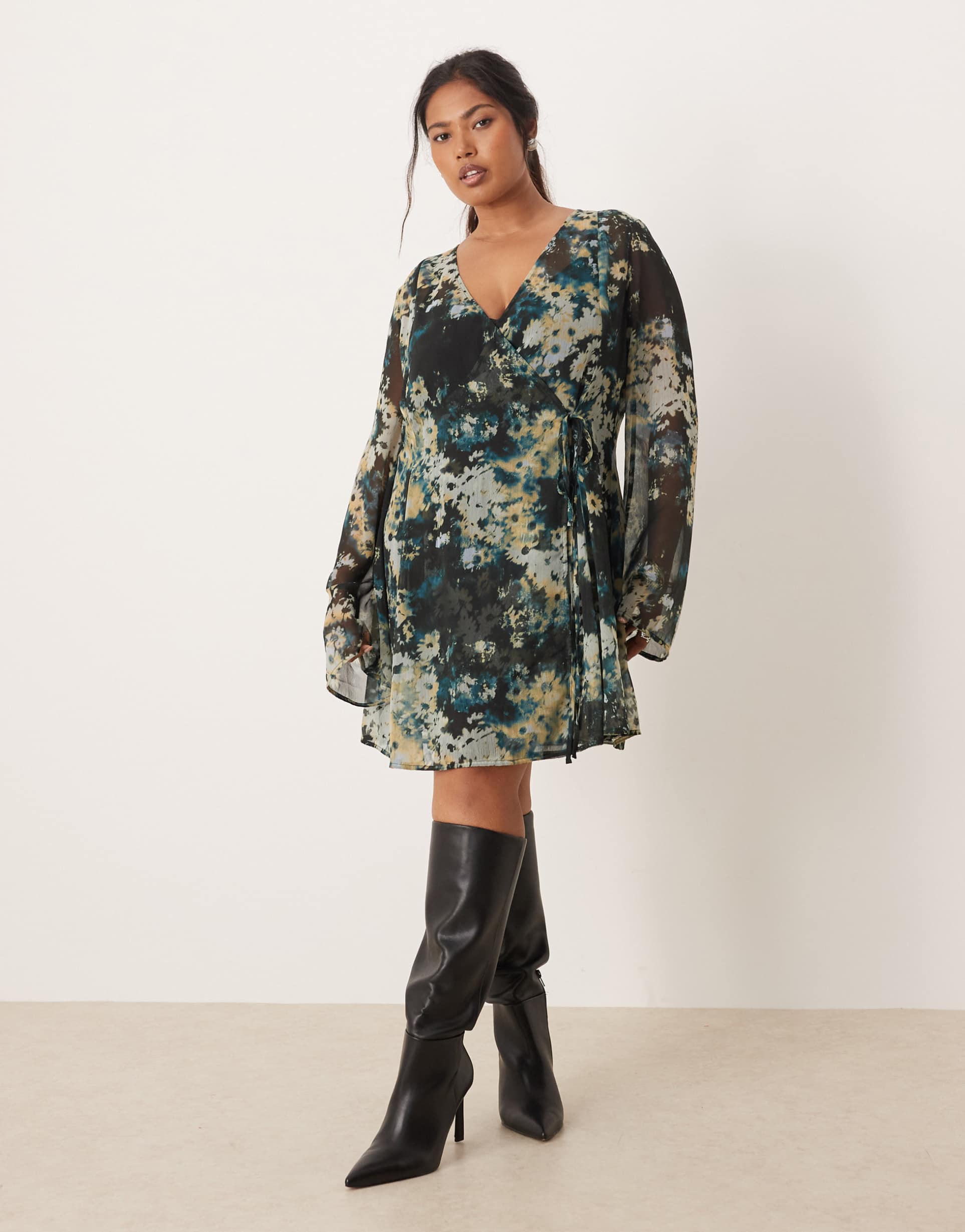 ASOS DESIGN CURVE WRAP MINI DRESS WITH TIES IN BLURRED BLUE FLORAL