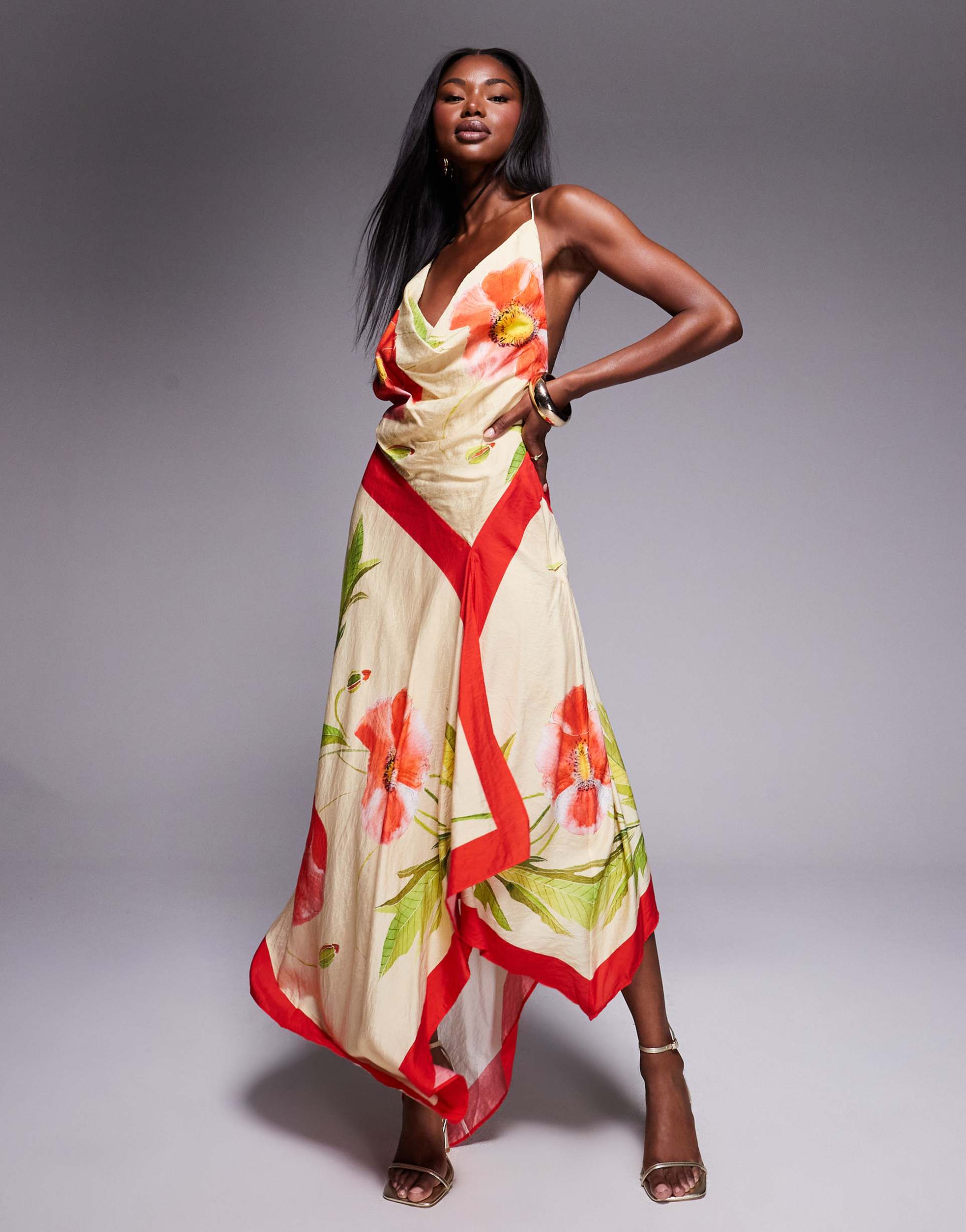 ASOS DESIGN DEEP COWL ASYMMETRIC OPEN BACK MAXI DRESS IN SCARF PRINT