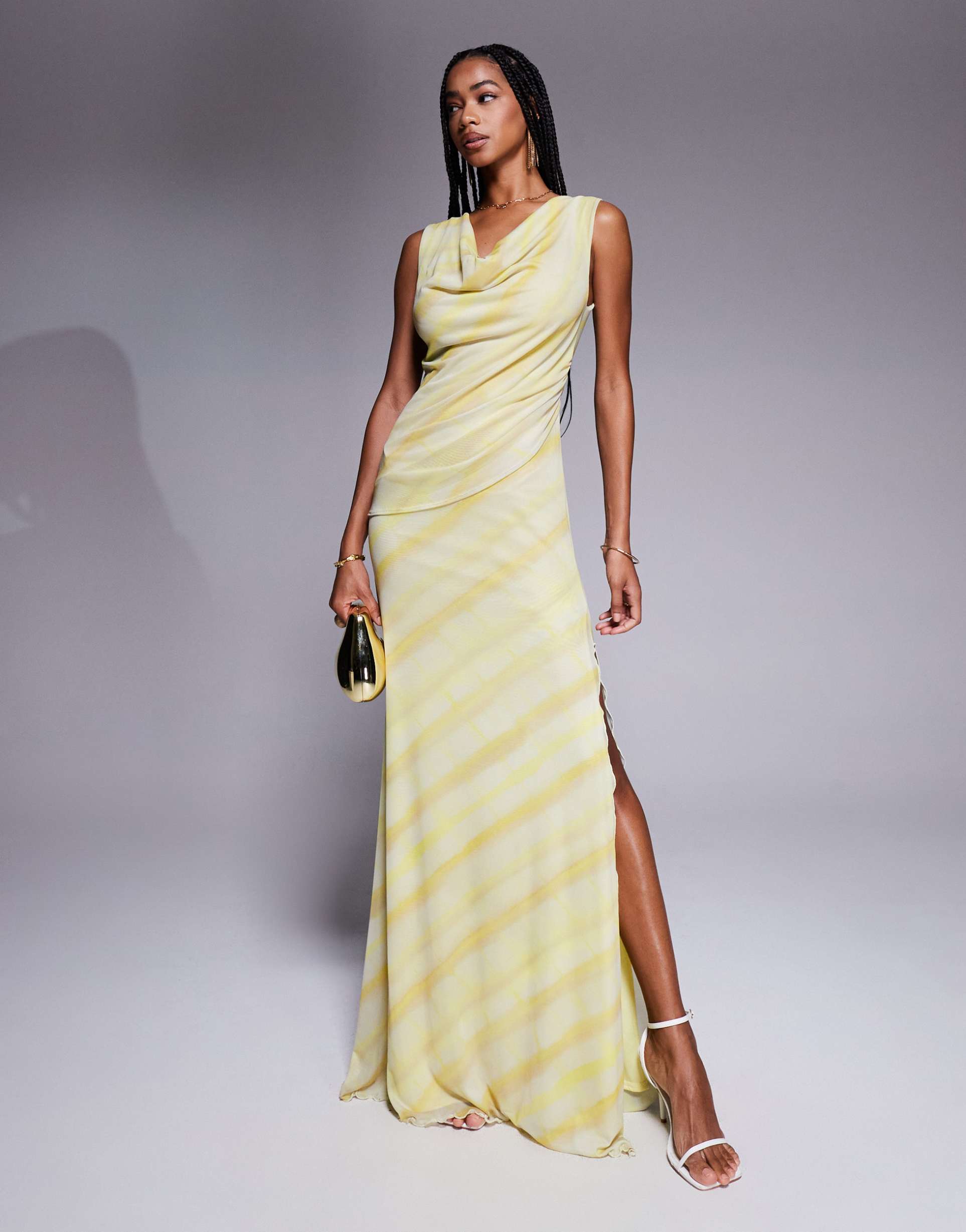 ASOS DESIGN DEEP COWL NECK MESH MAXI DRESS WITH TWISTED STRAP IN STRIPED PRINT