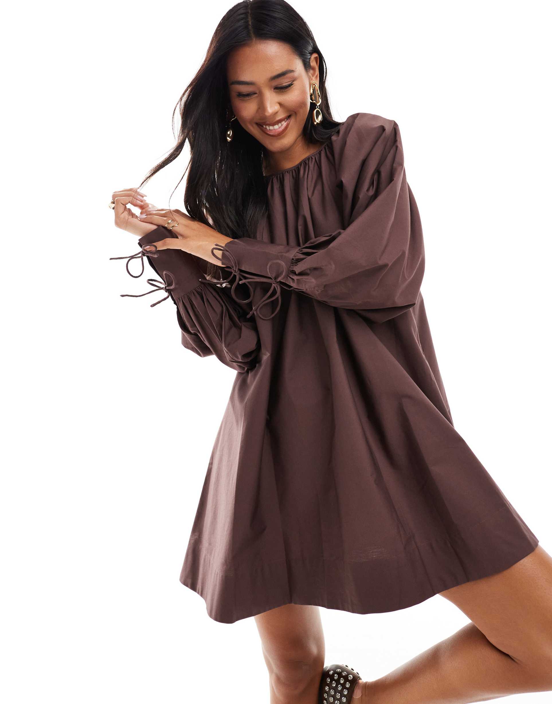 Feel-good and effortlessly chic, this chocolate ASOS DESIGN deep cuff mini dress brings weekend ease to a favorite silhouette. A round neckline meets voluminous puff sleeves that end in tied cuffs, creating a playful, contemporary vibe. Crafted in lightweight cotton for breathable comfort, the regular-fit shirt-dress skim is relaxed without losing polish. The mini hem keeps the look fresh and versatile, ready to pair with boots for evenings or sneakers for day trips. Pullover ease, wearable polish, and a timeless color make this piece endlessly styling-friendly for any casual occasion.