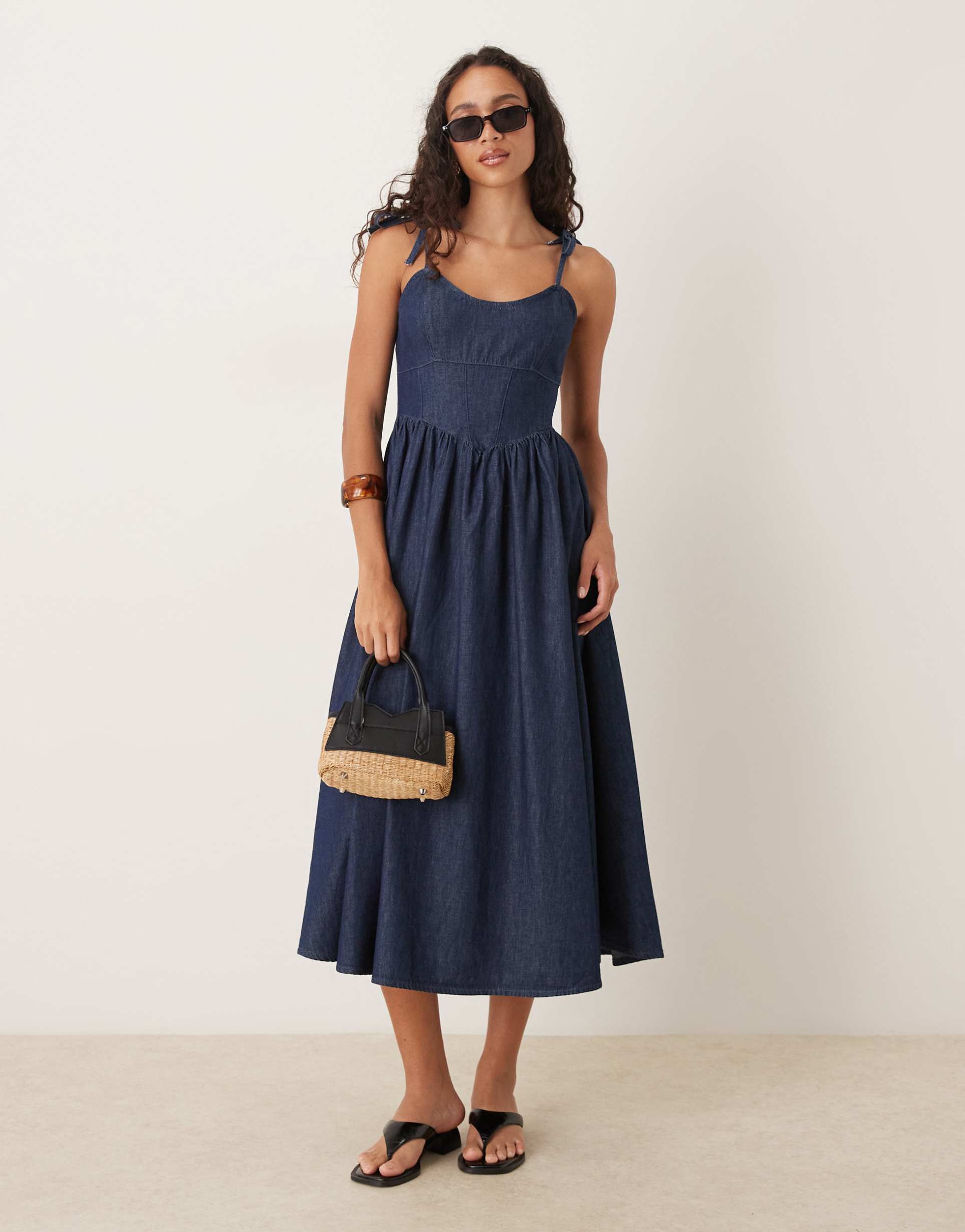 Effortless denim charm meets summer sophistication in this ASOS DESIGN denim ballerina midi dress in indigo. Crafted from non-stretch cotton denim with a rich dark-blue wash, it features a scooped neckline and delicate tie spaghetti straps that reveal just the right amount of skin. The sleeveless, regular-fit silhouette falls to a midi length with a clean hem, finished with a back zip for a smooth, seamless line. Versatile enough for brunch, vacation days, or a casual night out—pair with flat sandals or heeled espadrilles for an instantly polished, laid-back look.