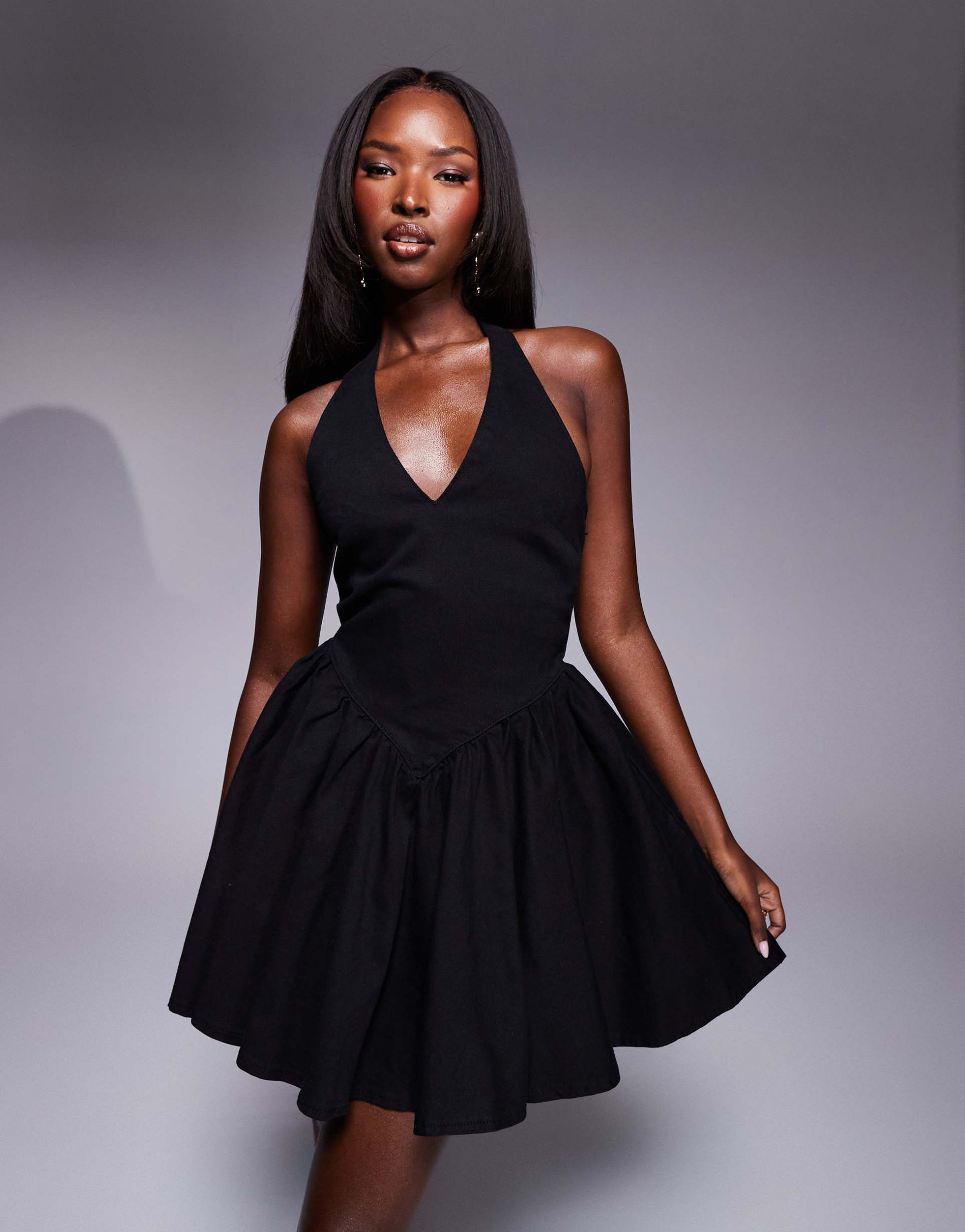 ASOS DESIGN DENIM HALTER NECK MINI DRESS IN BLACK