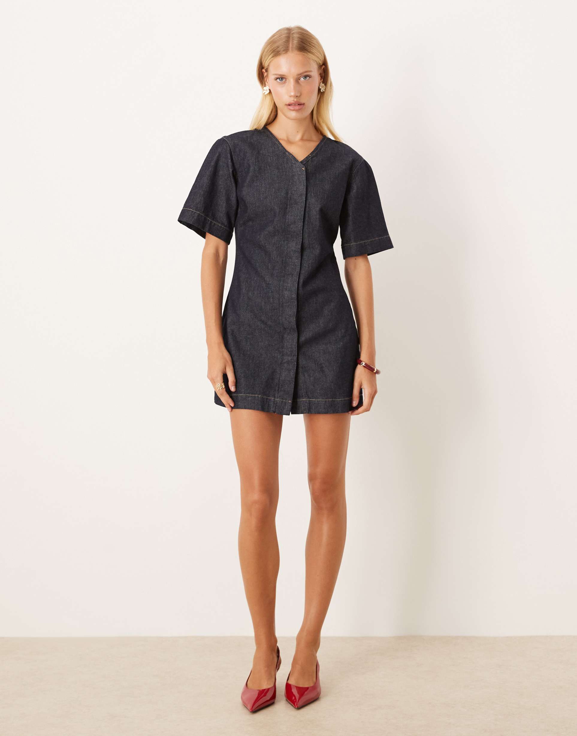 ASOS DESIGN DENIM HIGH V NECK MINI DRESS WITH SHORT SLEEVE IN INDIGO