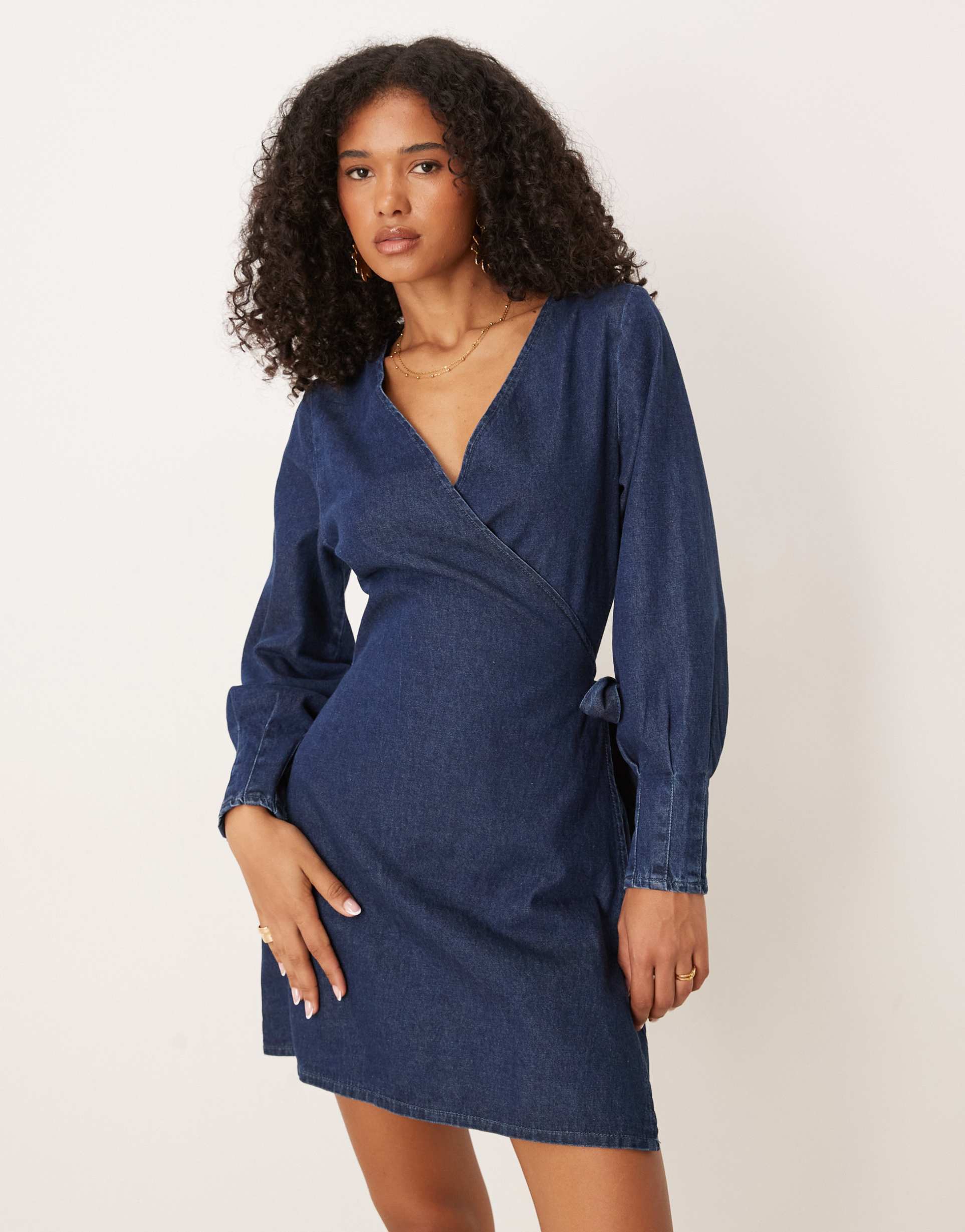Rinse dark denim in a versatile wrap dress silhouette featuring a flattering V-neckline and long sleeves finished with pleated cuff details. The mini length and regular fit create an easy, casual chic look perfect for brunch, casual outings, or date nights. Crafted from 100% cotton non-stretch denim, it offers breathable comfort with a classic edge. The tie-side fastening emphasizes the waist, enhancing the feminine shape, while the clean hemline keeps the style sleek and polished for transitional spring and autumn wear.